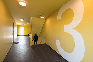 in the north and south, the apartments are accessed via an arcade, in the east and west there are maisonette apartments that are accessed from the courtyard. the orientation of the living spaces is always in the direction of the inner courtyard. a common room and baby buggy storage rooms are also taken into account in the planning.