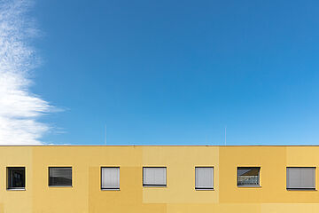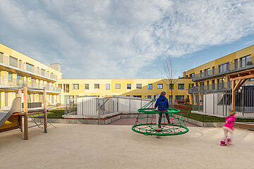 the project has the form of a “square courtyard”. the resulting inner courtyard offers numerous places to stay and also serves as an access zone. the residential complex comprises a total of 71 residential units from around 55 sqm to just over 100 sqm with sufficient car and bicycle parking spaces.