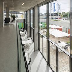 on two storeys office- and working-spaces are flexibly arranged. an especially for this task developed furniture item offers protected places for communication and rest. the top floor is an flexible plateau - an open, expandable eventzone can be extended to the offices of the ceo's, but these offices can also be completely seperated from this open zone.