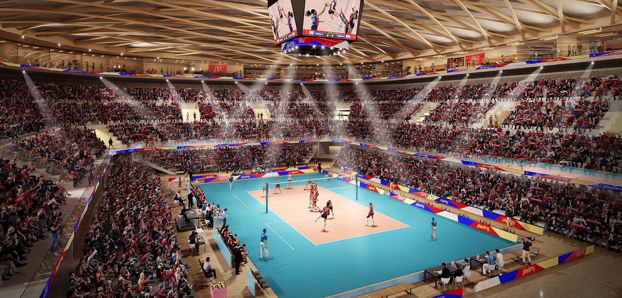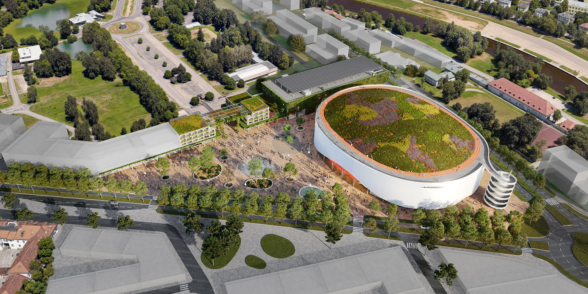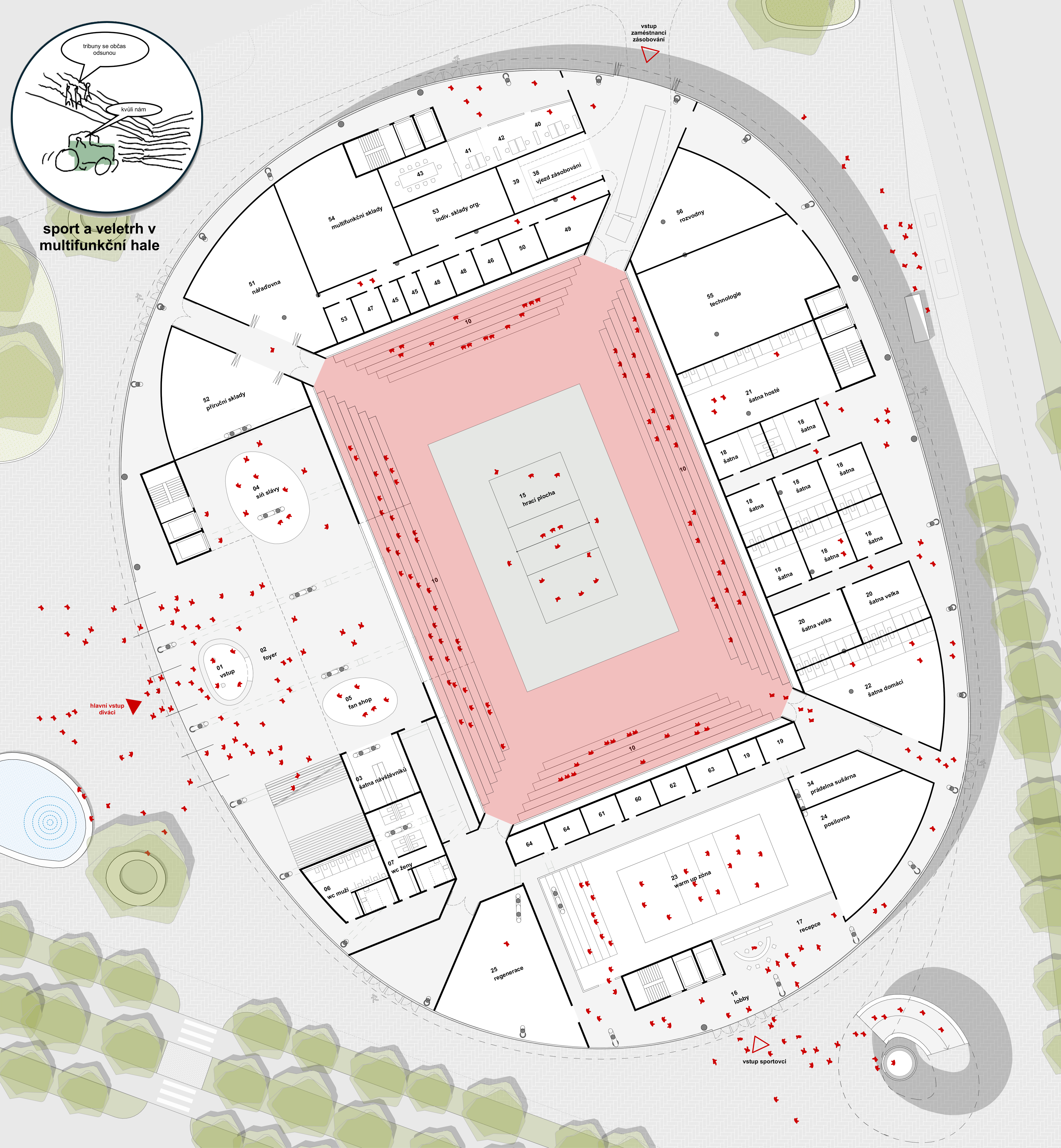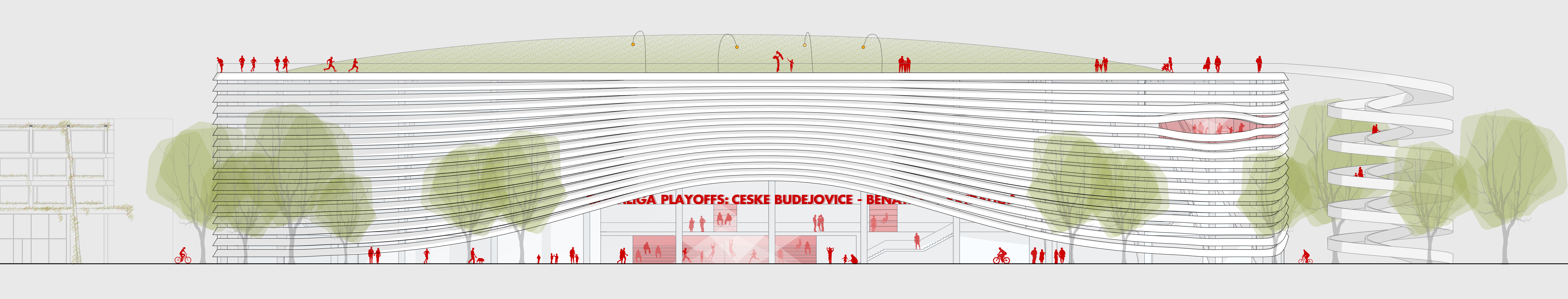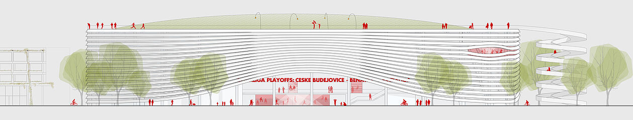 the ball sports hall in české budějovice is a multifunctional center that adapts flexibly to different uses. retractable stands transform the sports hall into an open exhibition space for fairs and events. the architecture opens up to the urban space, creating a place where community, movement, and experience come together.
