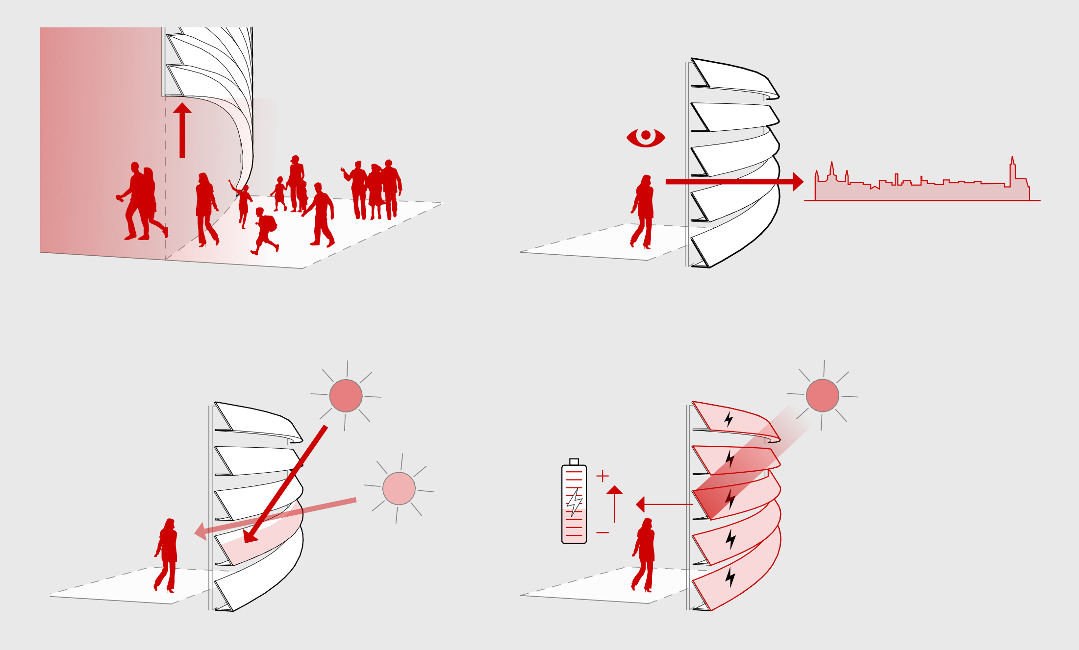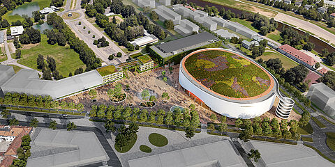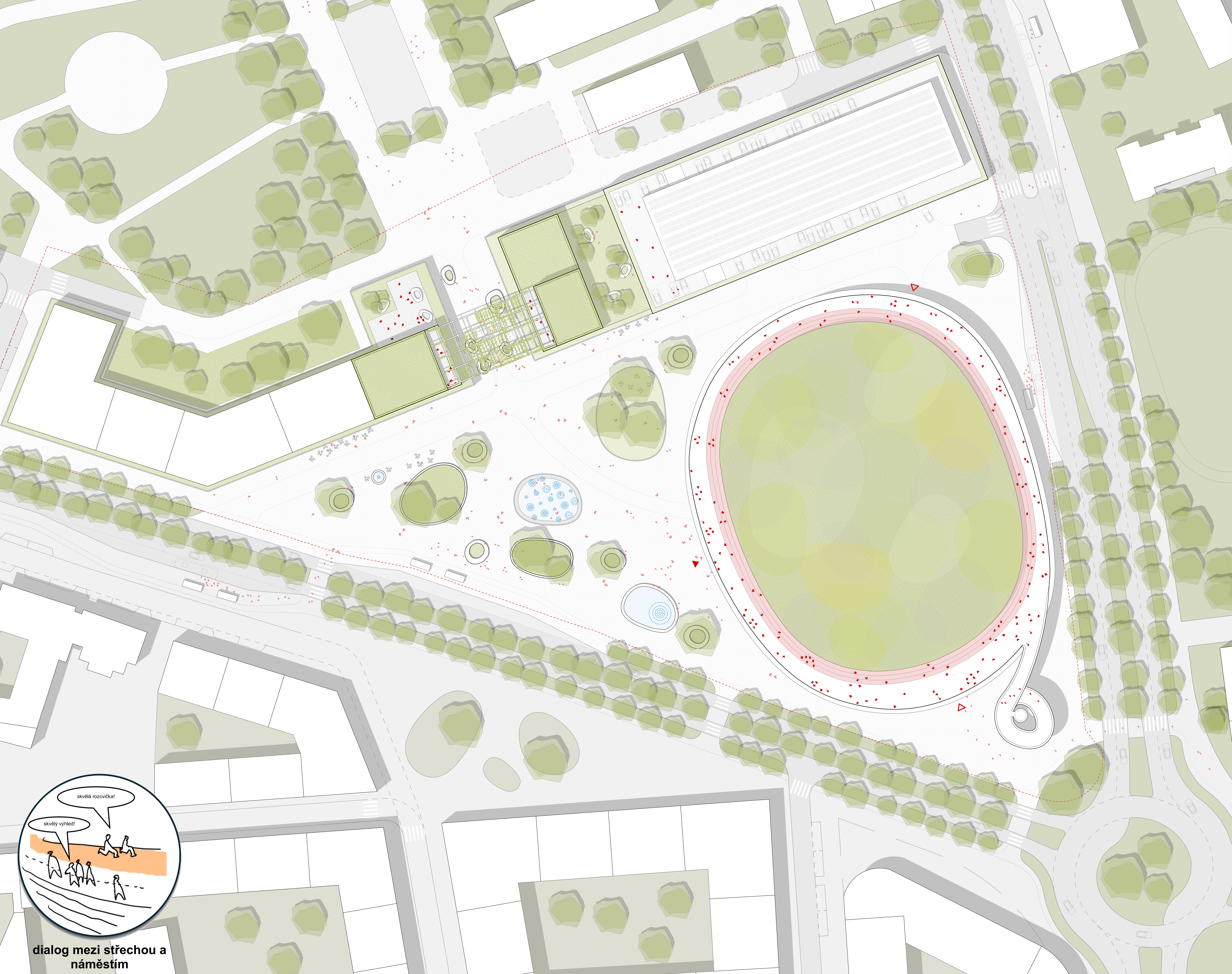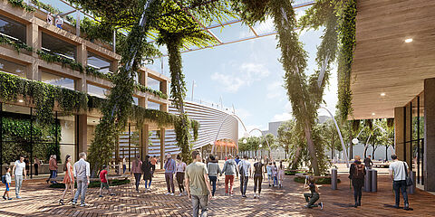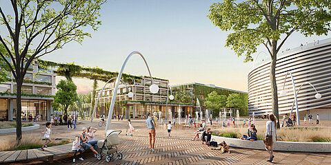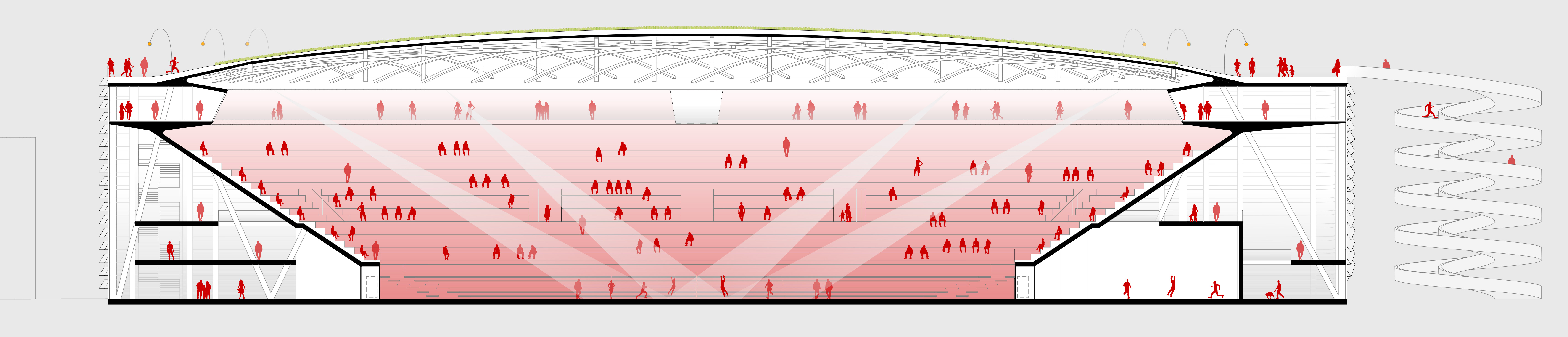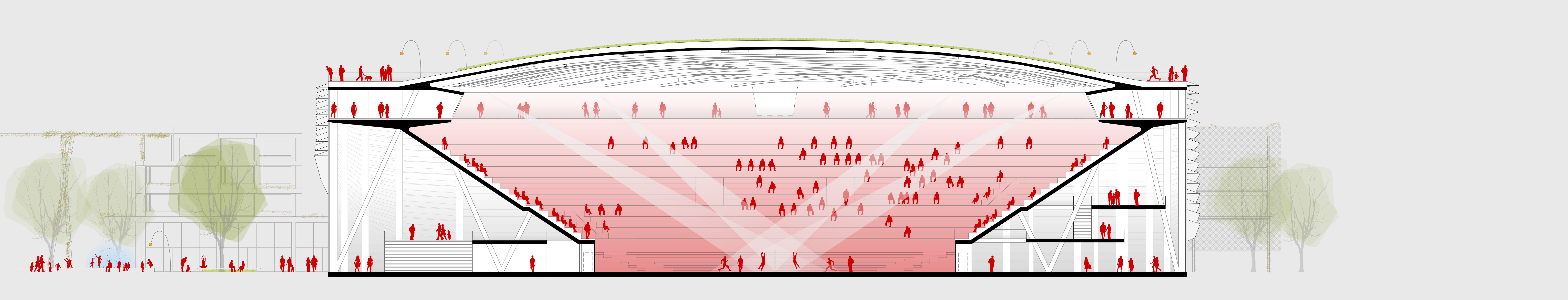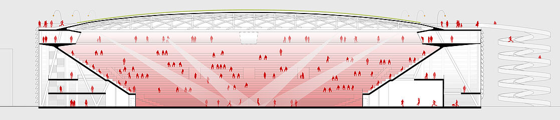 the publicly accessible roof with a running track connects directly with the square in front of the arena. a spiral ramp leads to the green rooftop landscape with views over the city. arcades, water features, and trees create a pleasant microclimate and invite residents and visitors to linger.