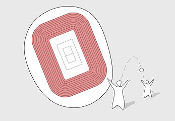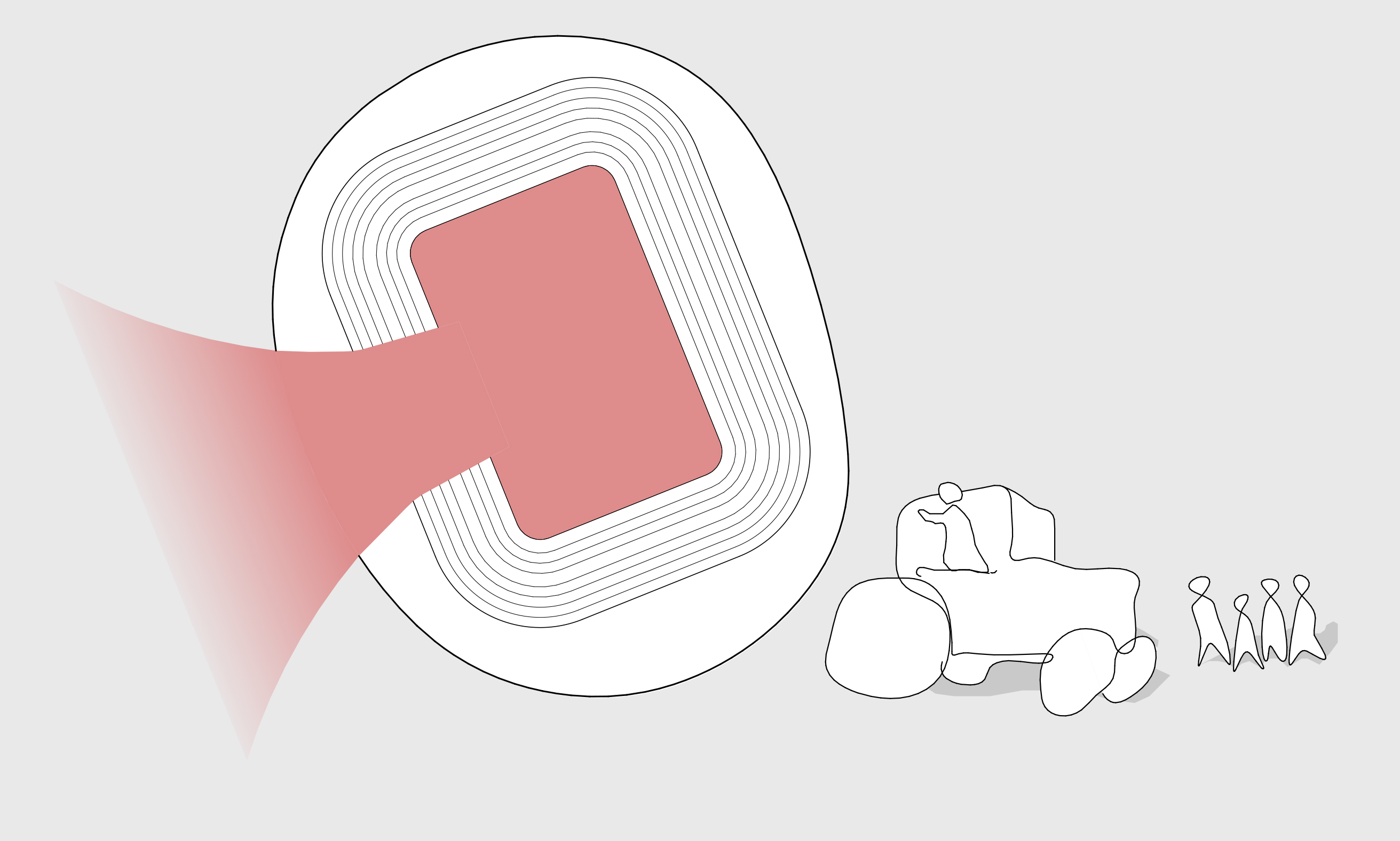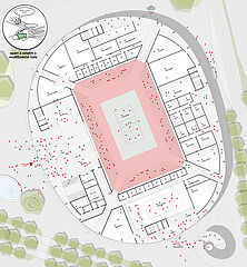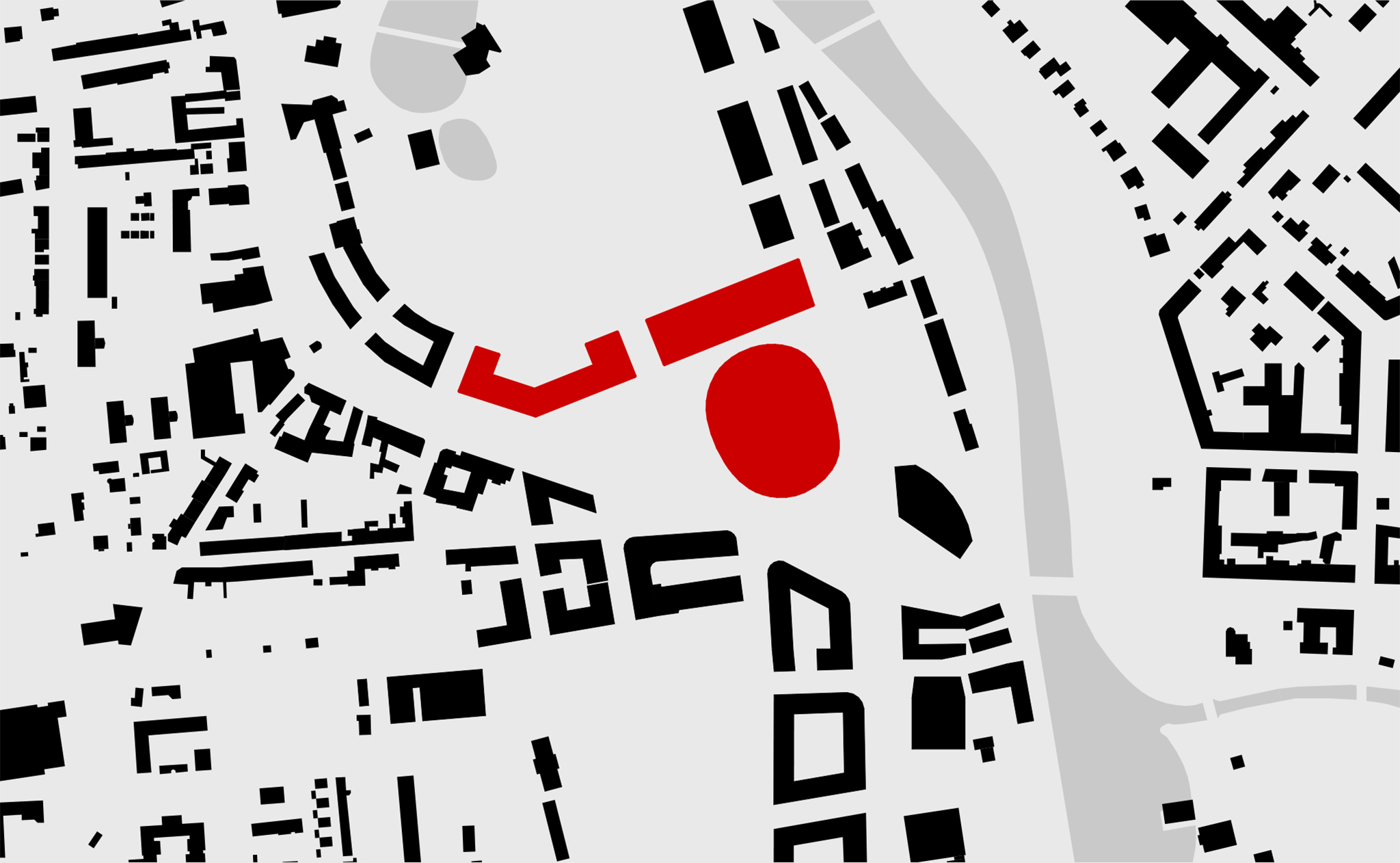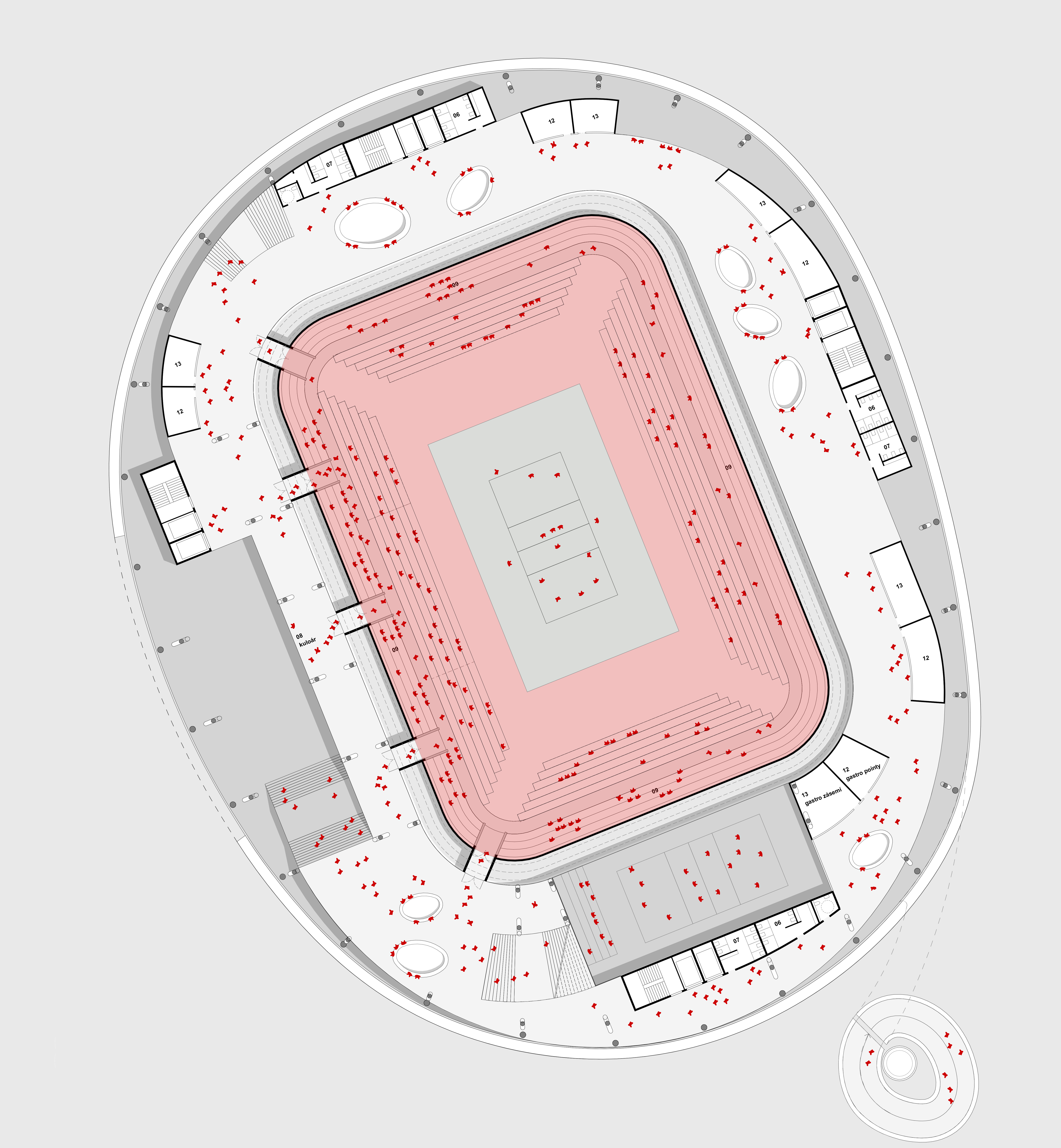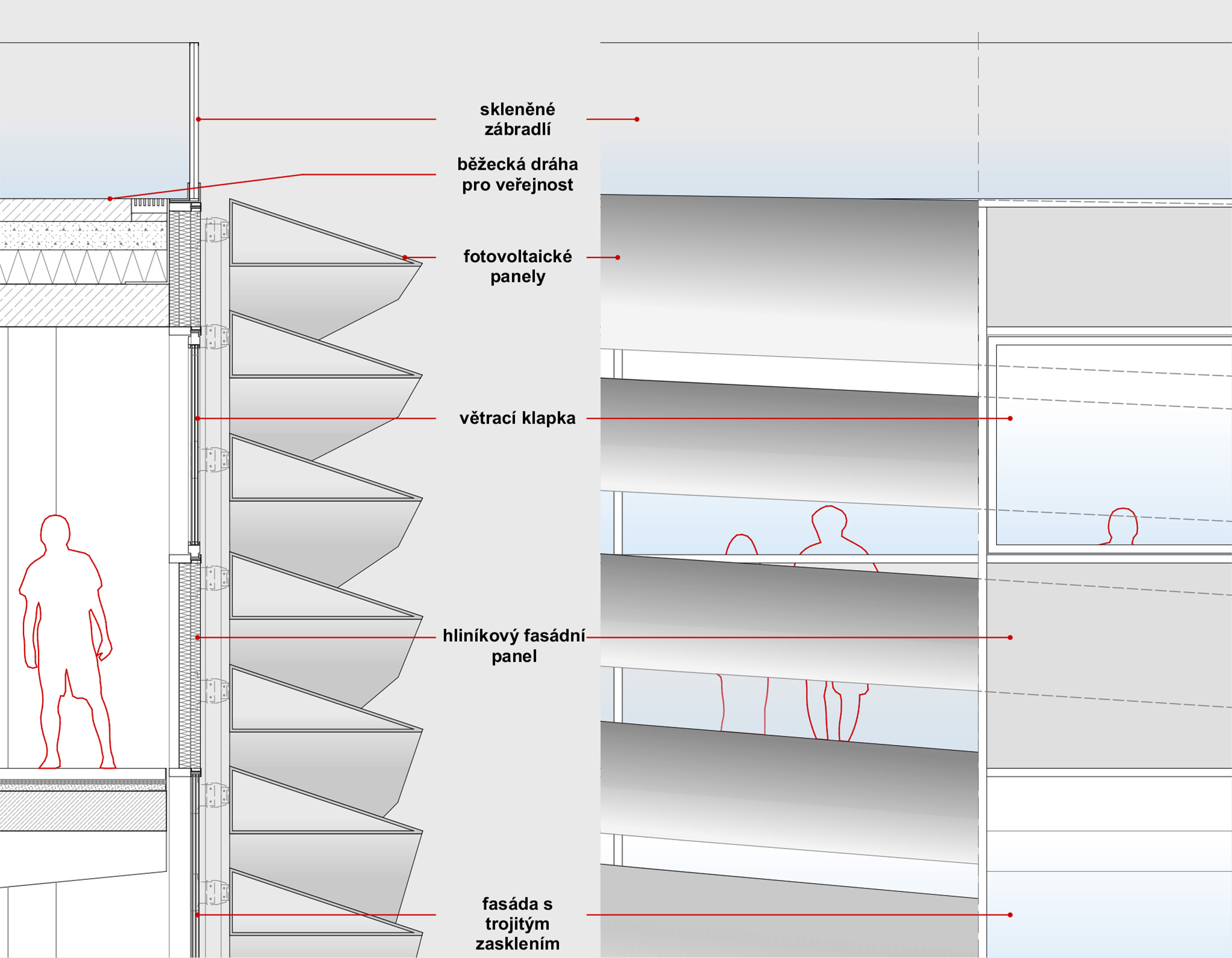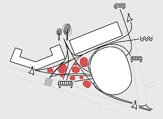 the publicly accessible roof with a running track connects directly with the square in front of the arena. a spiral ramp leads to the green rooftop landscape with views over the city. arcades, water features, and trees create a pleasant microclimate and invite residents and visitors to linger.
