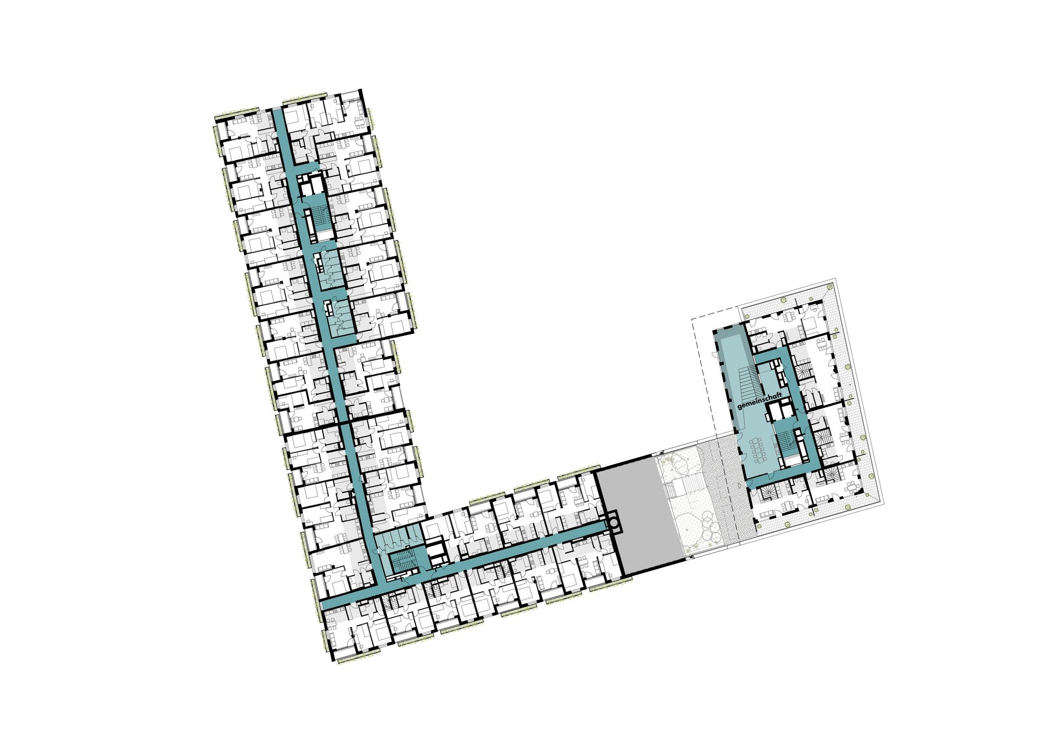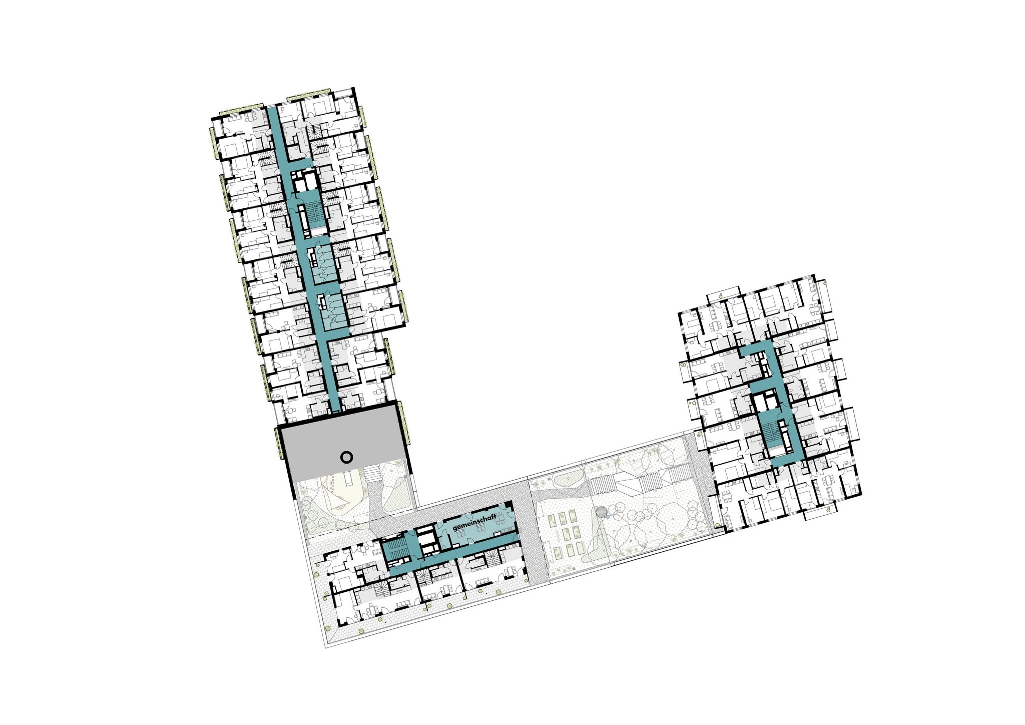 the landscape running upwards is animated by different user groups and communal spaces. shared flats, offices and maisonette flats are orientated towards the green spaces and complemented by communal facilities such as a kitchen, laundry room, exercise room, urban gardening and a children's playground. these areas are divided into different levels of publicity and encourage the residents to come together.