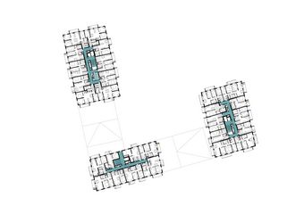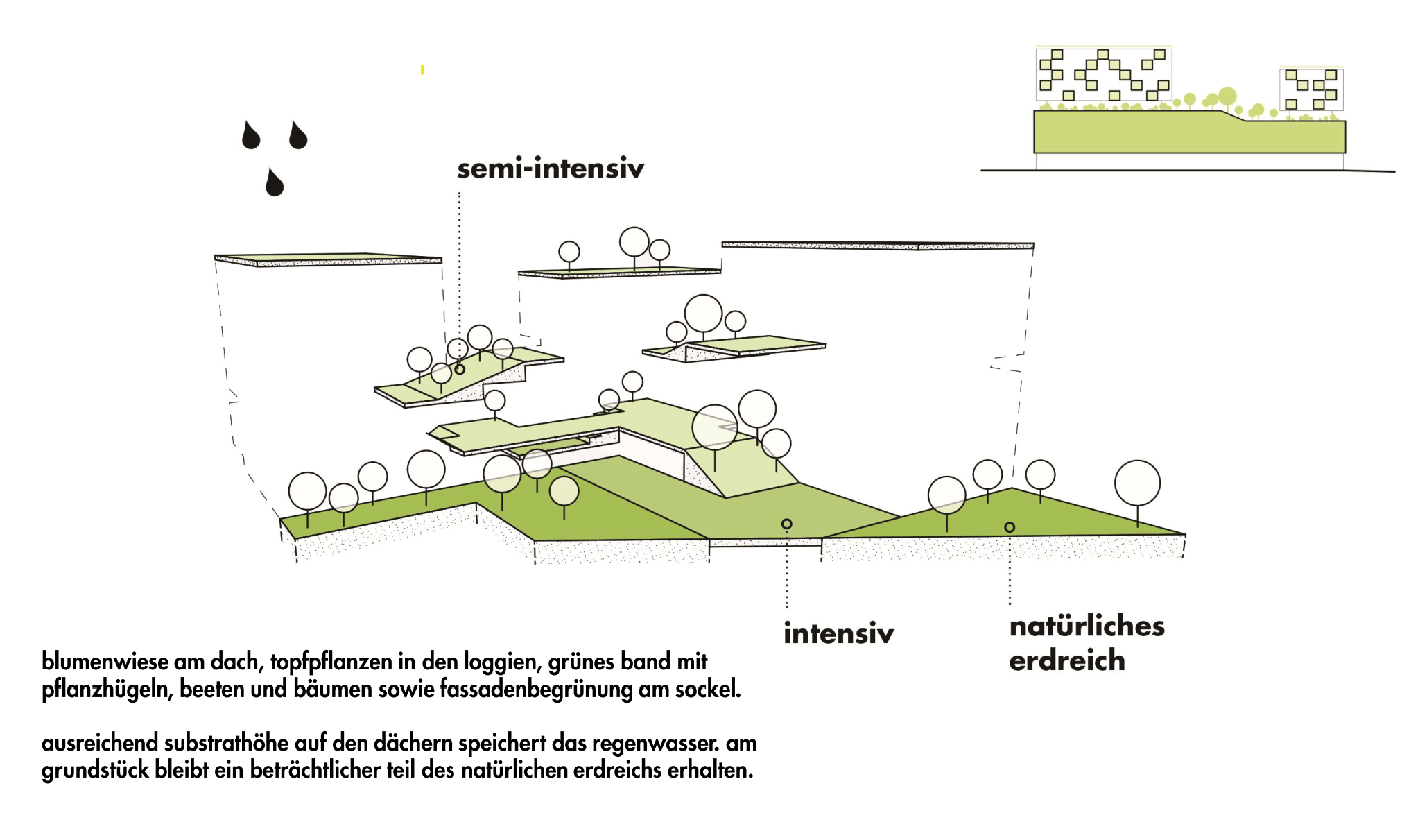 three structures - one 30 metres and two 35 metres high - stand on the greened base, which cascades like a green ribbon up to the fifth storey. the horizontal layering with base, staggered storey and exposed high points divides the overall cubature into clearly legible, scaled volumes. the façades are characterised by airy loggias and balconies with generous troughs for the greenery on the façades.