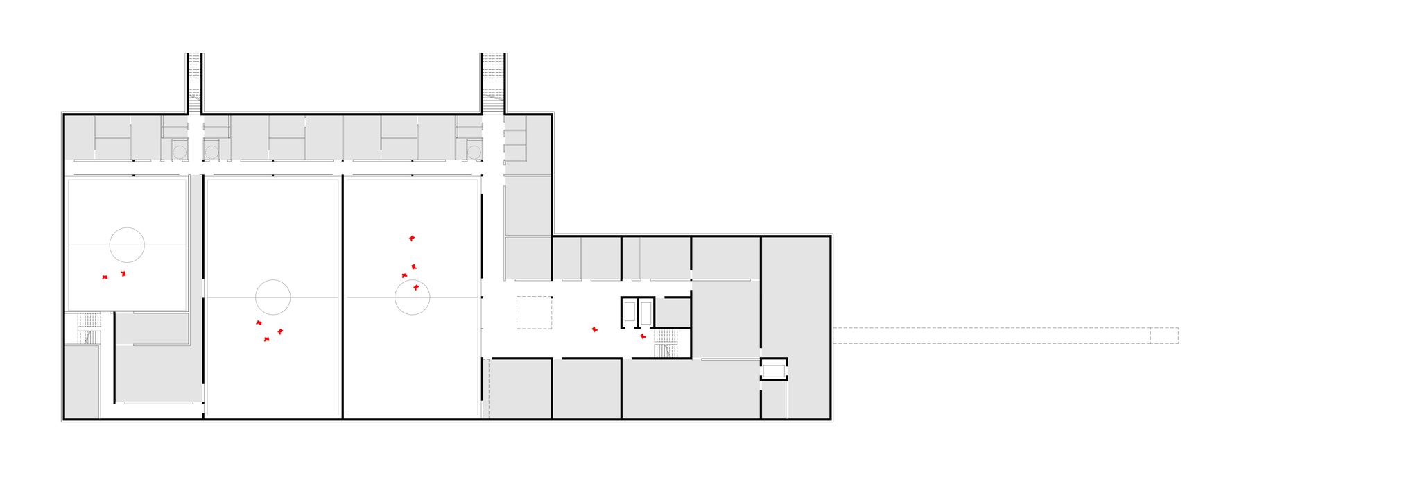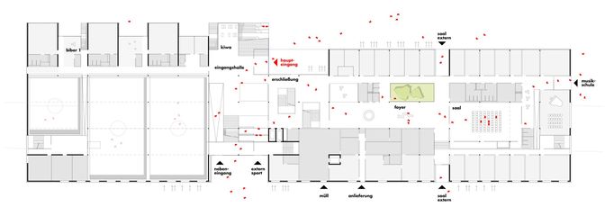 the district square is enlivened and activated by the music school/hall, the inventory hall and the sports areas. the gyms are externally accessible from landgutgasse.