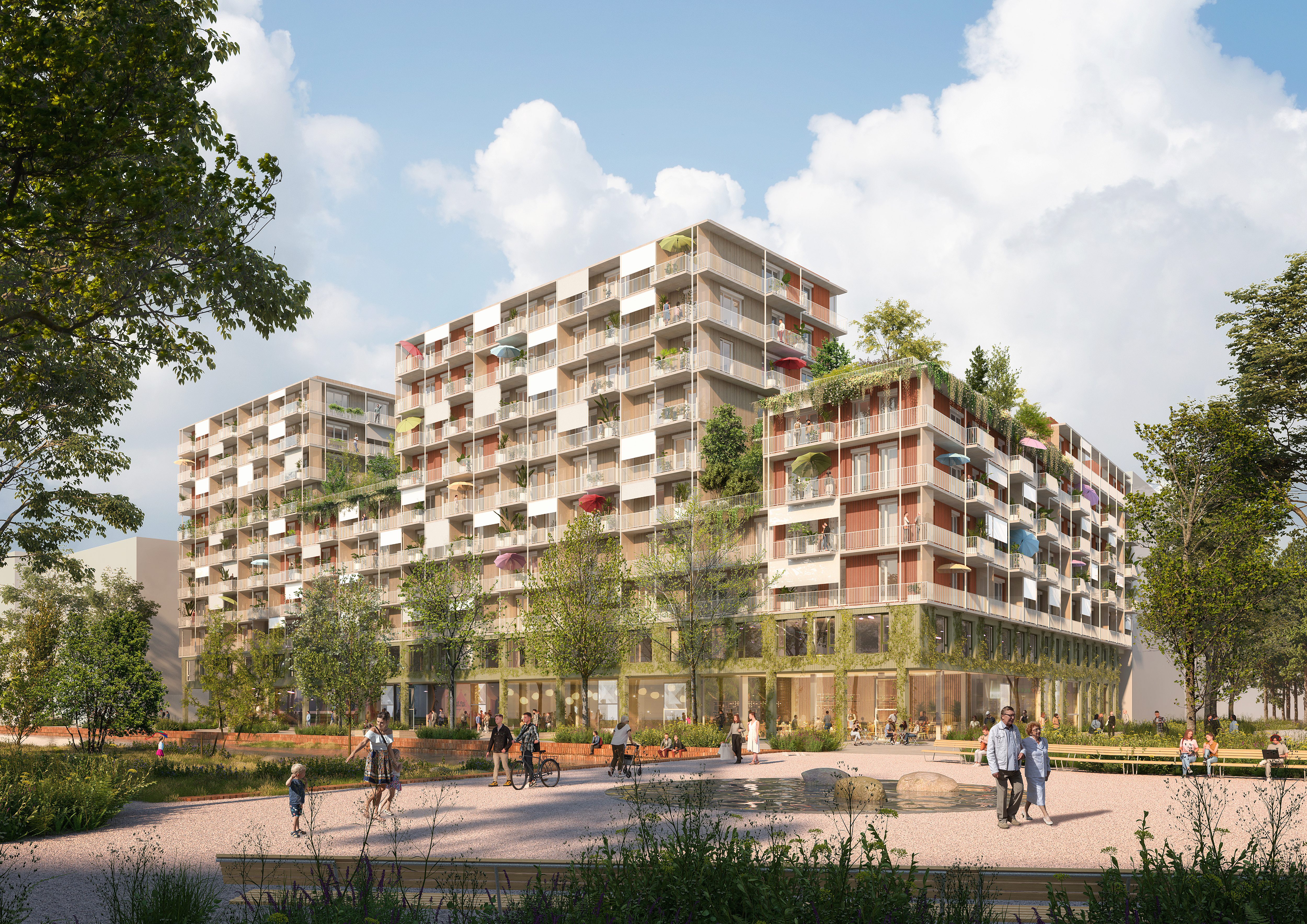 a two-story commercial area at the base of the building provides for diverse communal spaces, fostering social interaction and energizing the neighborhood. from urban gardening to facilitated neighborhood projects, the building promotes social bonds and supports sustainable living practices. interaction zones, such as the courtyard garden and rooftop sun deck, offer spaces for all generations—whether gardening, cooking, or playing together. specially designed areas for single parents, seniors, and children create an inclusive and socially sustainable living environment.