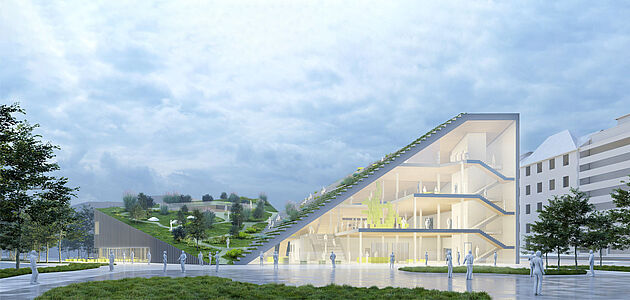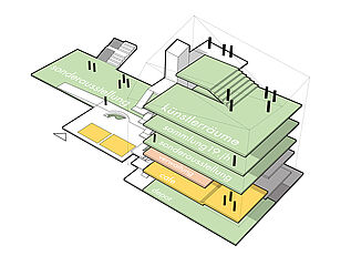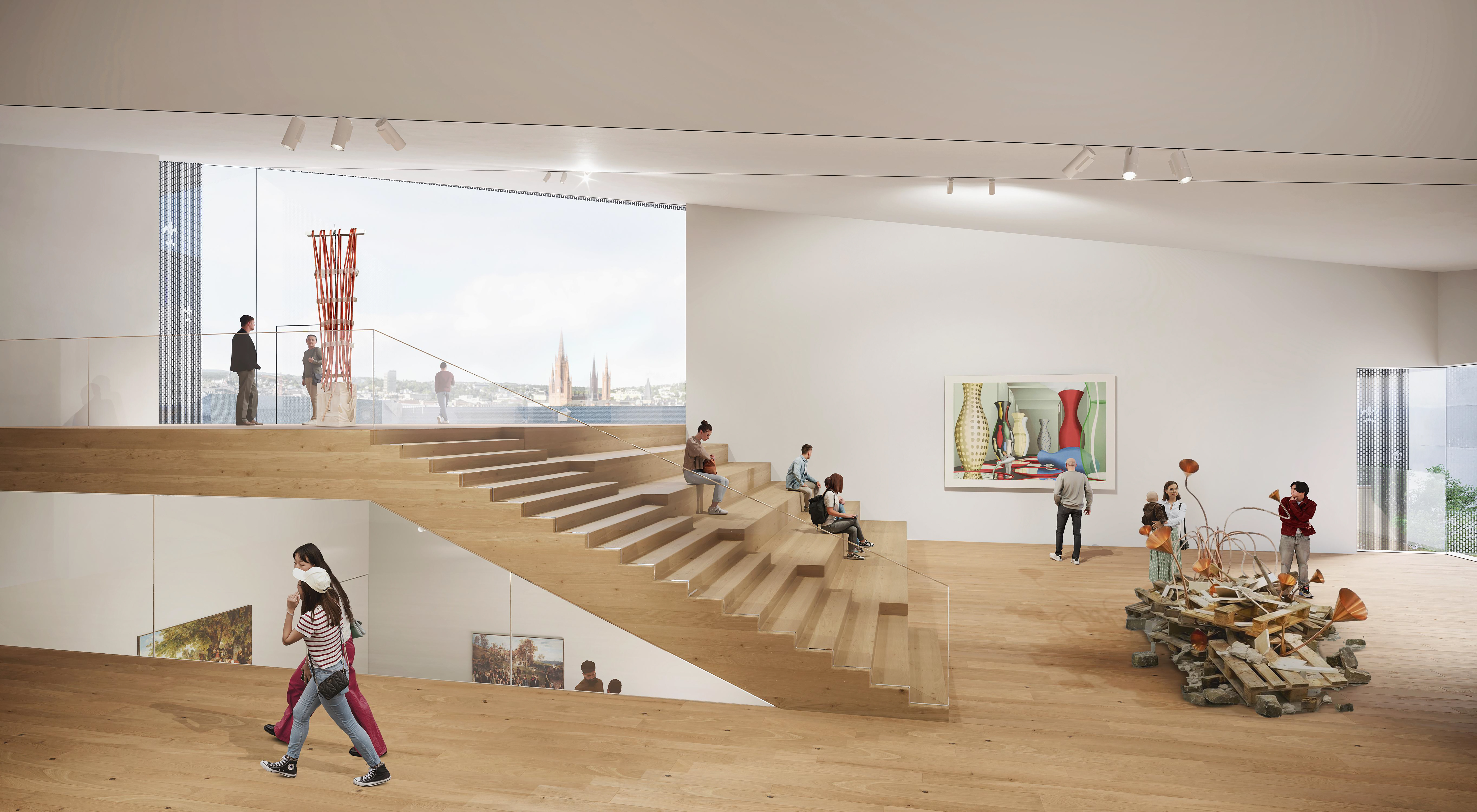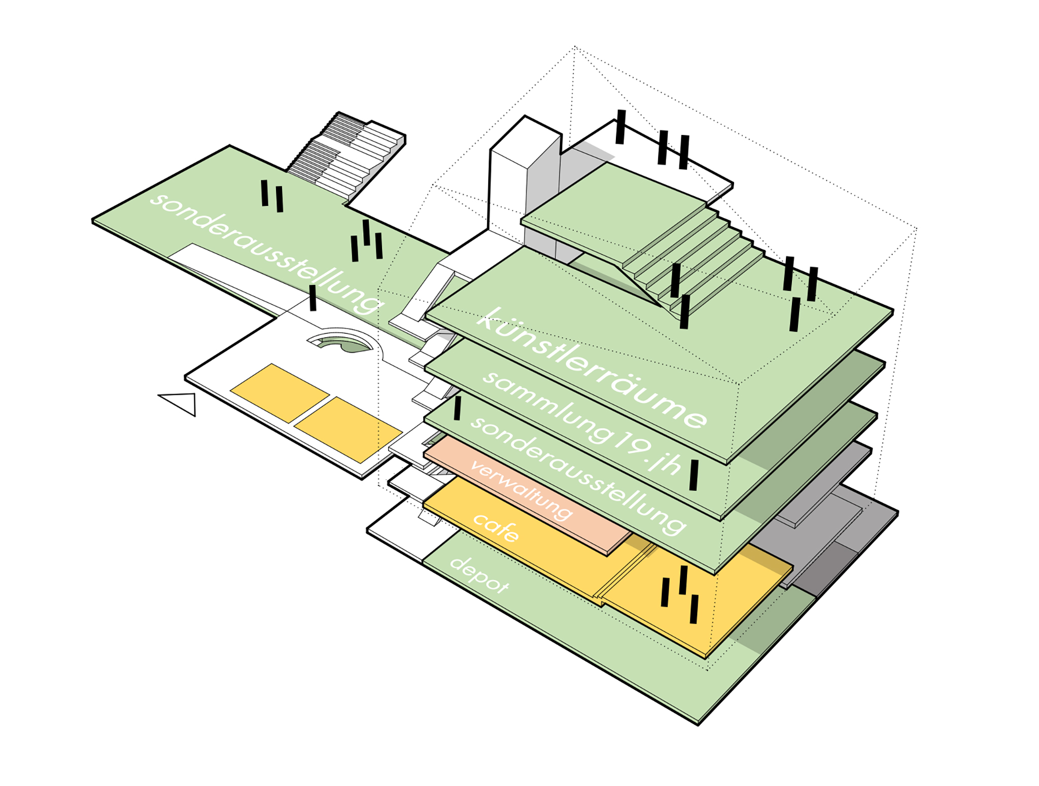 the functional layout of the new building follows a clear order: connecting bridges and access spines lead to flexible exhibition spaces. a demountable timber modular construction improves the ecological footprint and supports circularity. generous sightlines, barrier-free connections, and daylight-flooded artist spaces create an open, future-oriented museum experience.