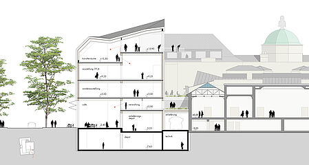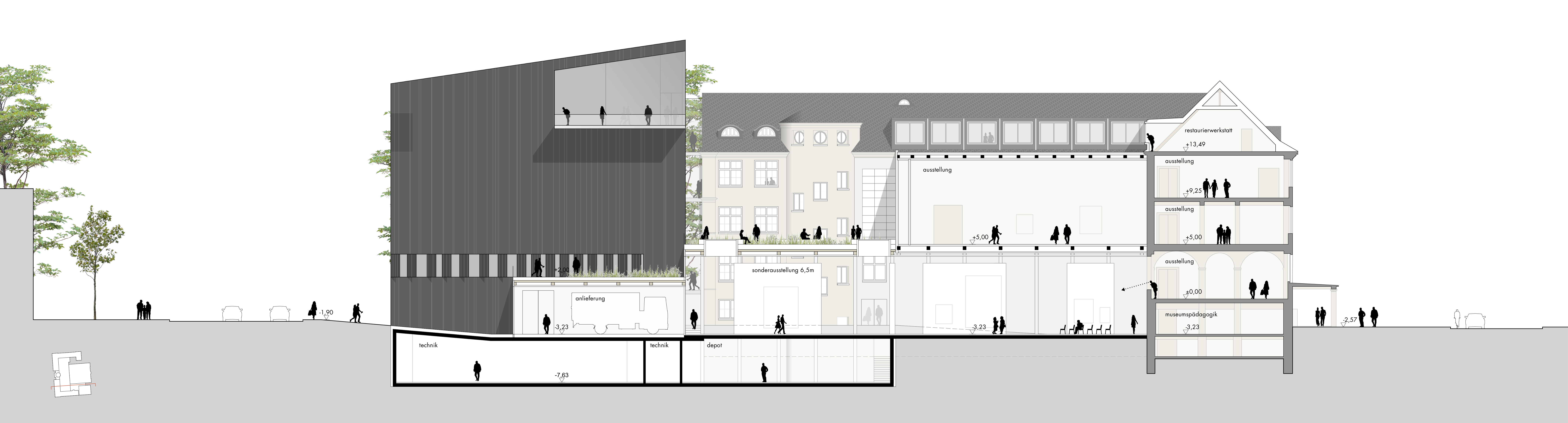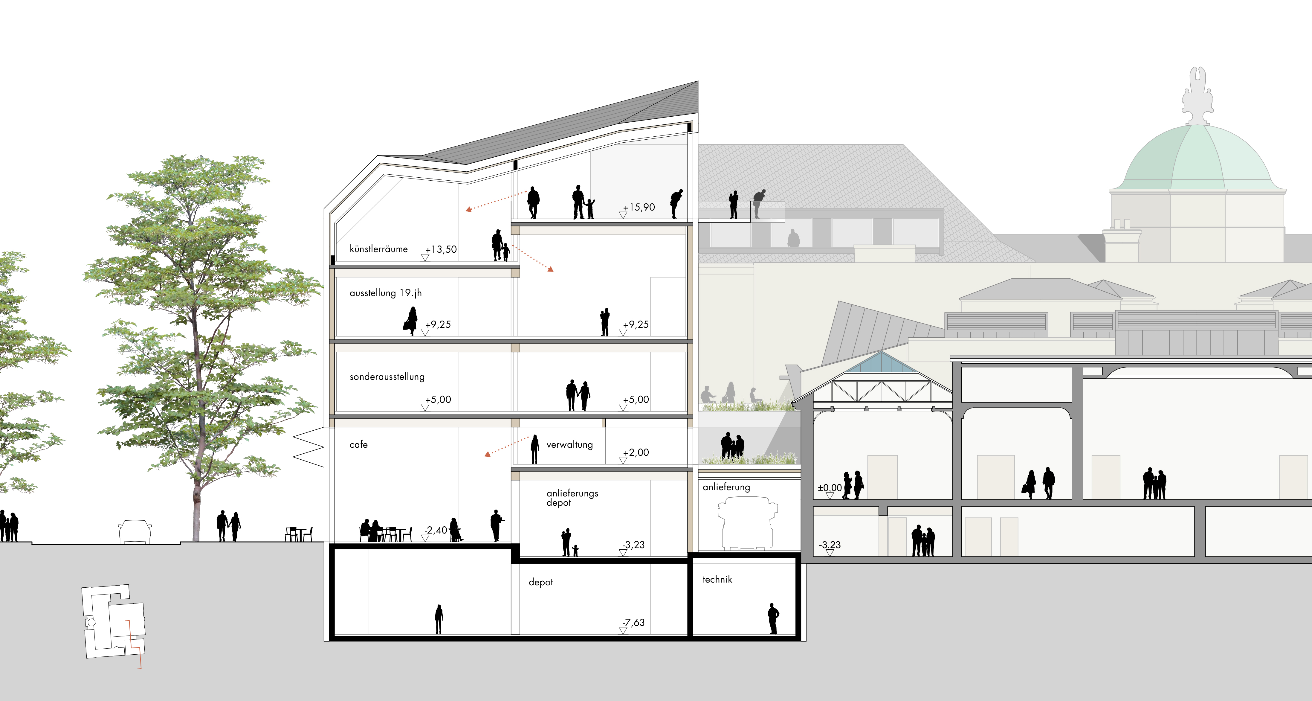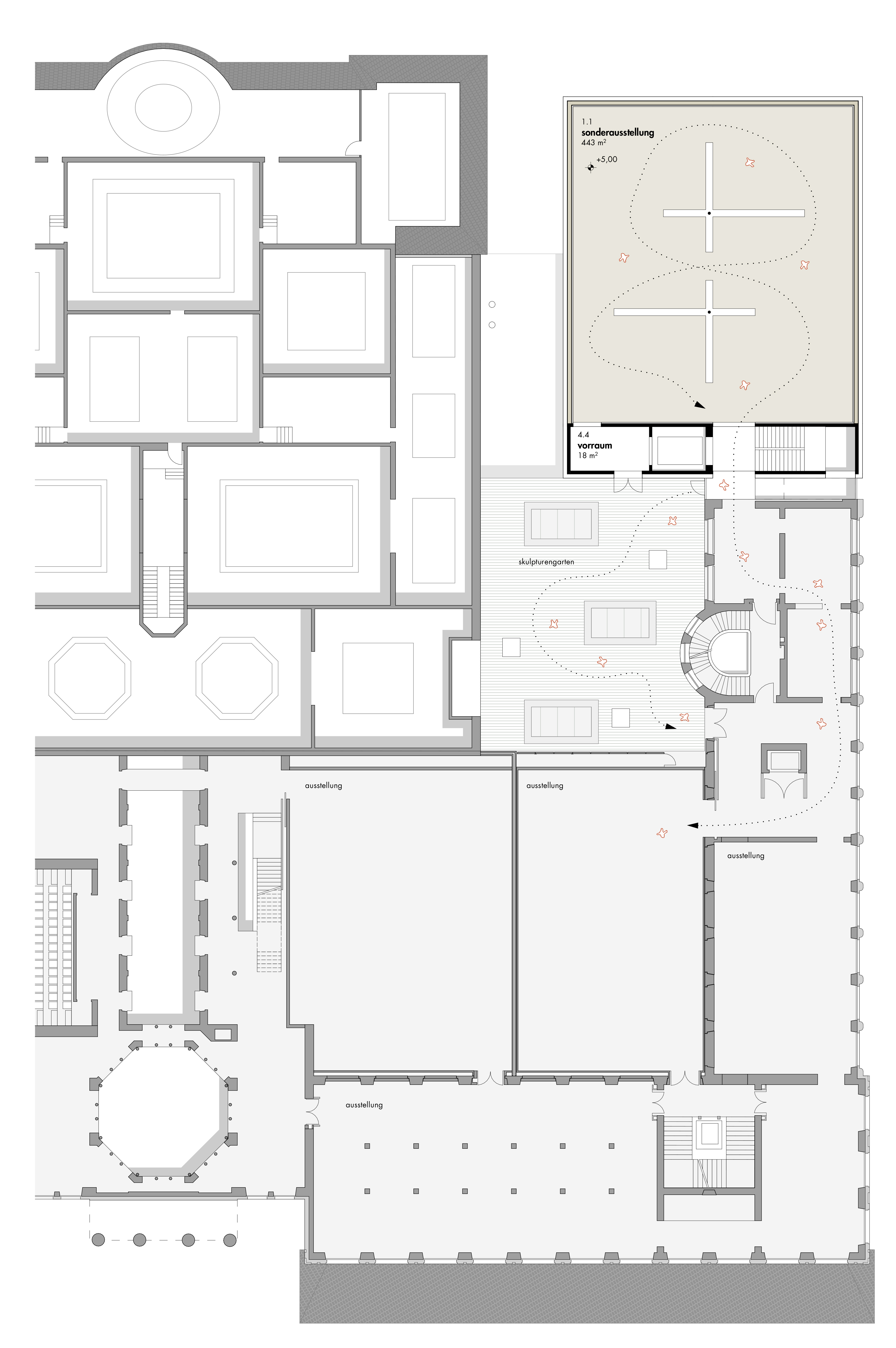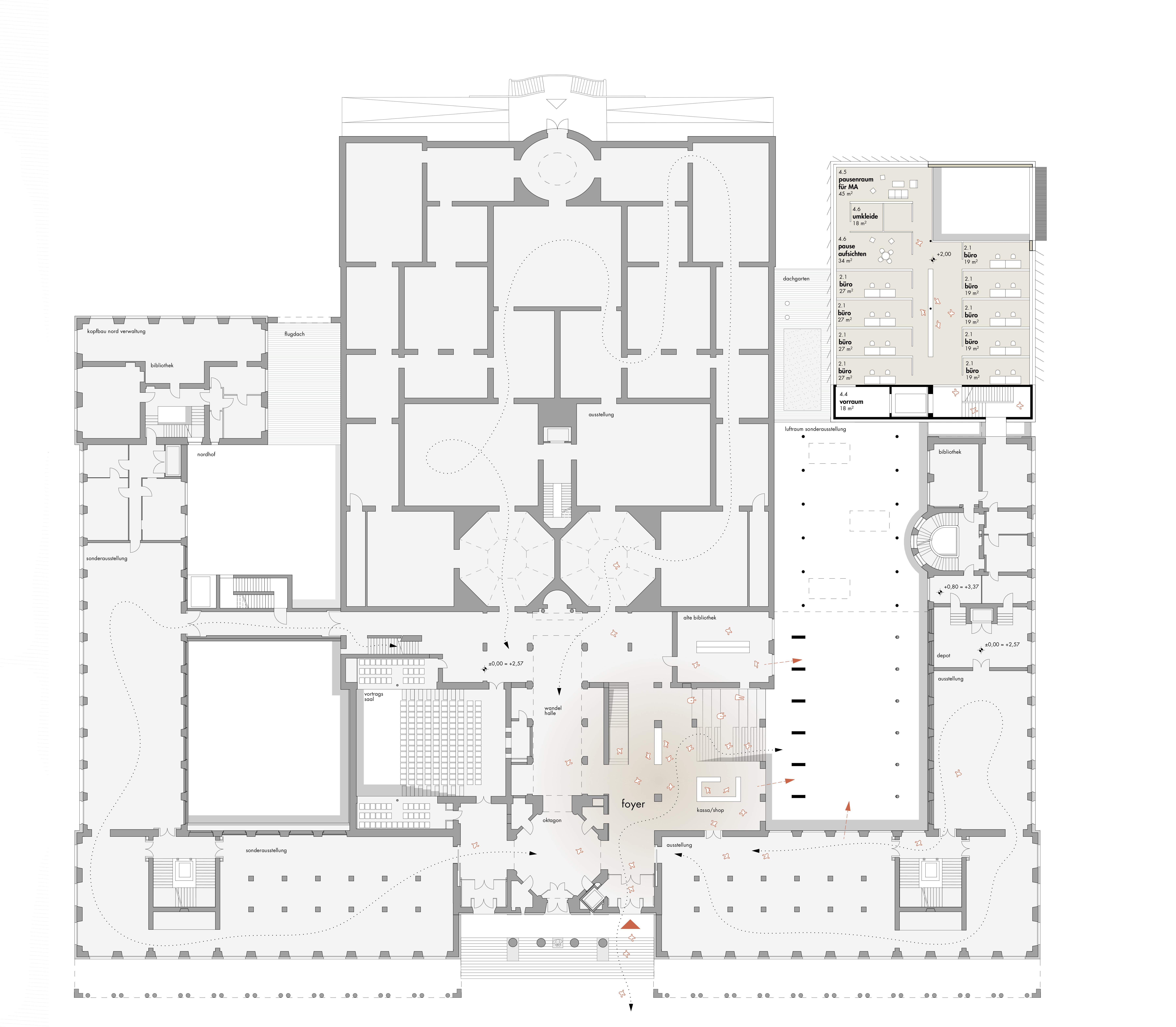the new building, with its clear and flexible form, responds to the proportions of the existing structures and creates a sensitive transition through an architectural joint. a second vertical accent enters into dialogue with the historic dome, completing the ensemble. the newly organized foyer with a generous staircase connects the old and new buildings through the special exhibition area, which serves as a central link and can also be used for events.