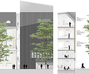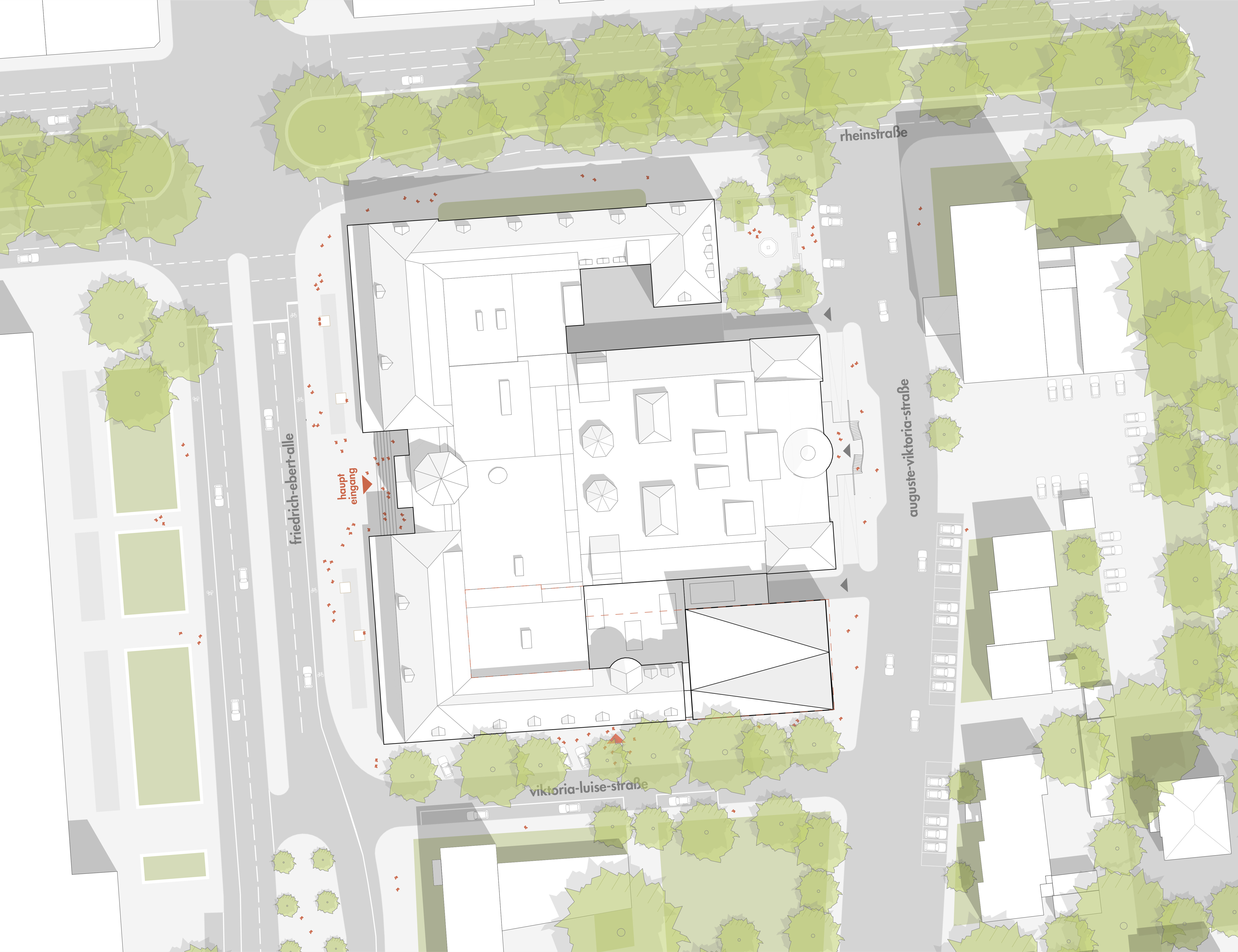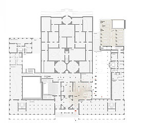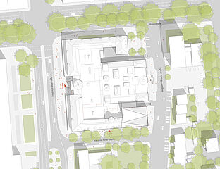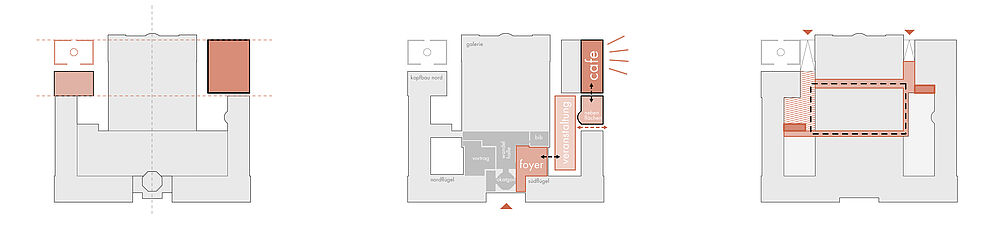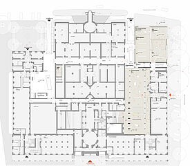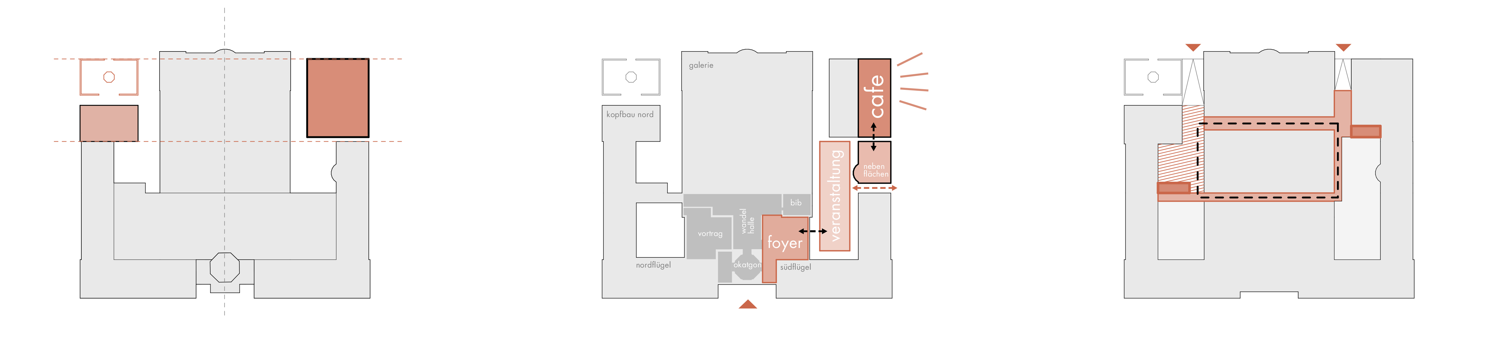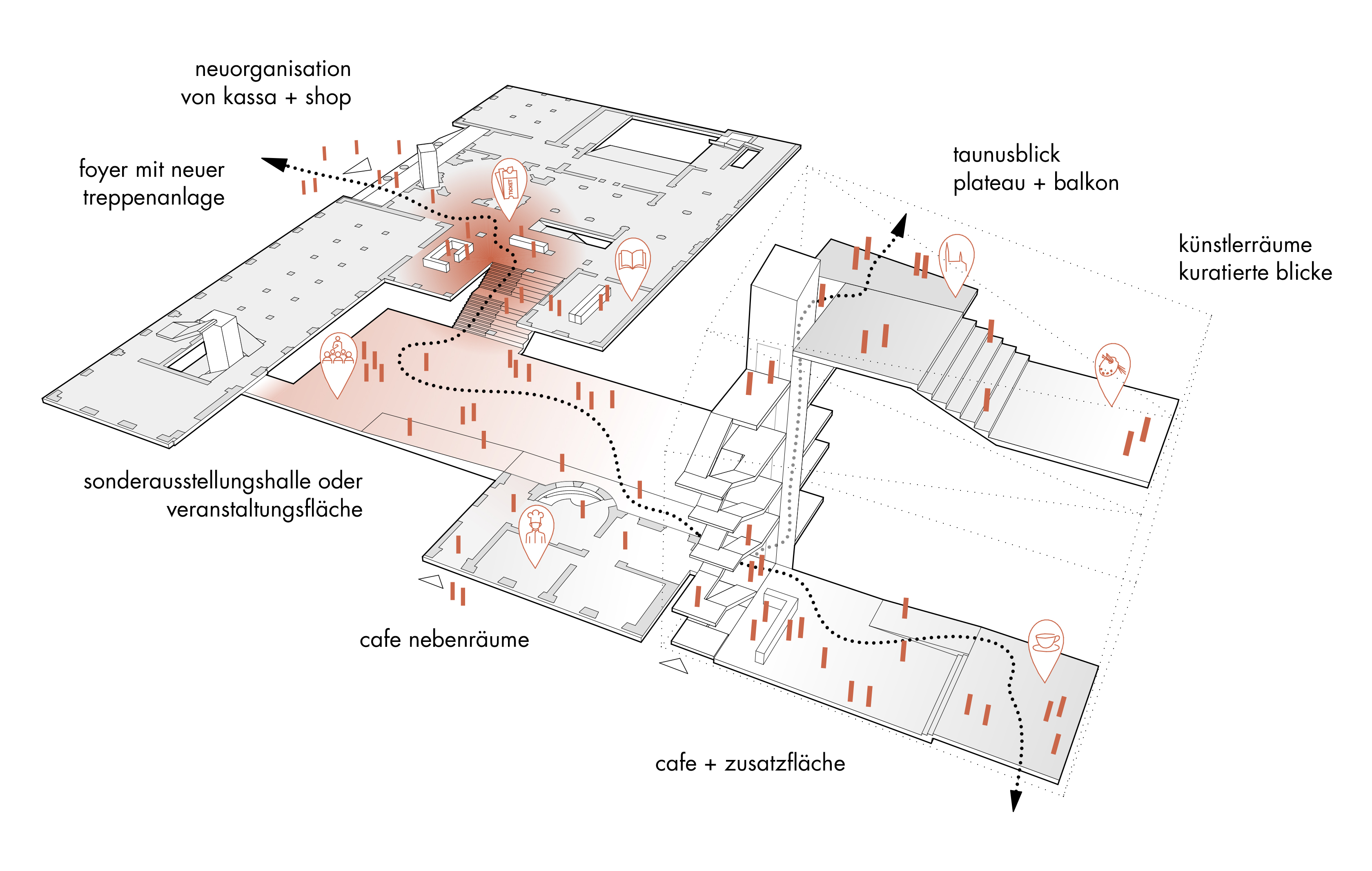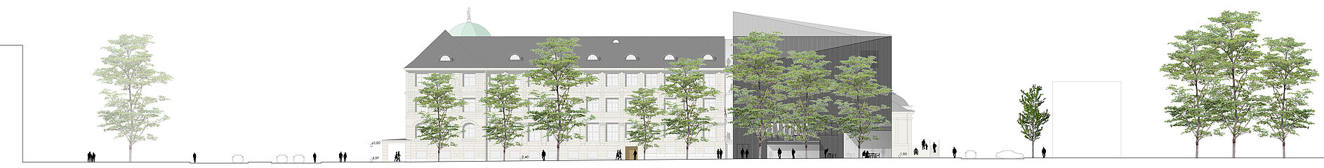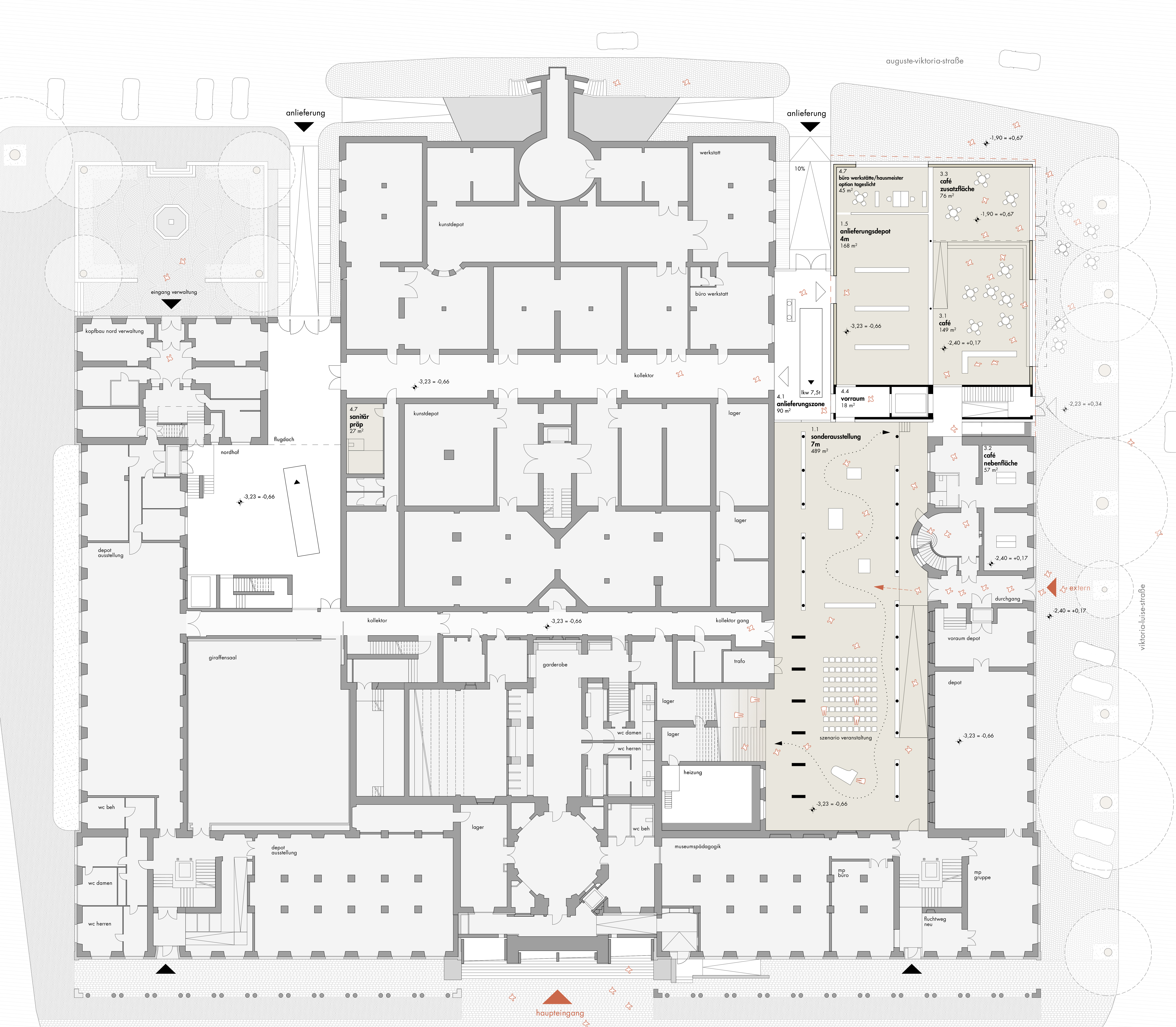 the new building, with its clear and flexible form, responds to the proportions of the existing structures and creates a sensitive transition through an architectural joint. a second vertical accent enters into dialogue with the historic dome, completing the ensemble. the newly organized foyer with a generous staircase connects the old and new buildings through the special exhibition area, which serves as a central link and can also be used for events.