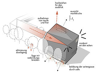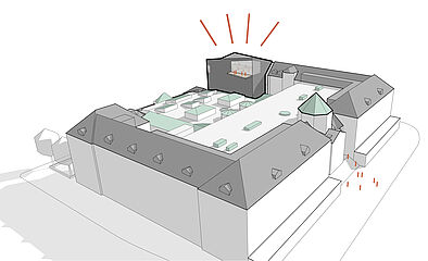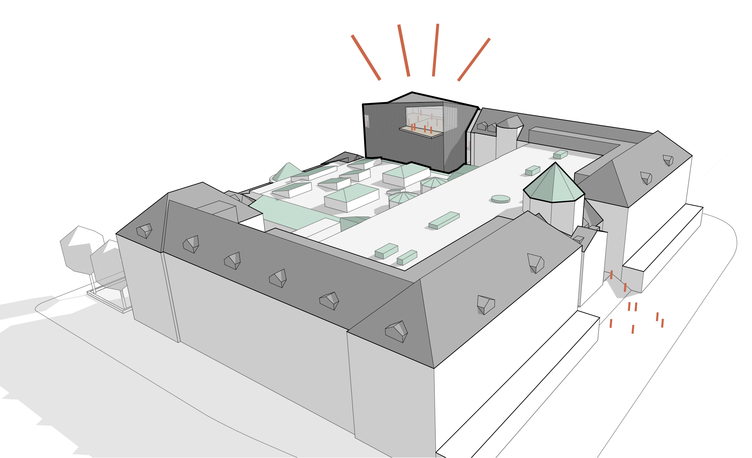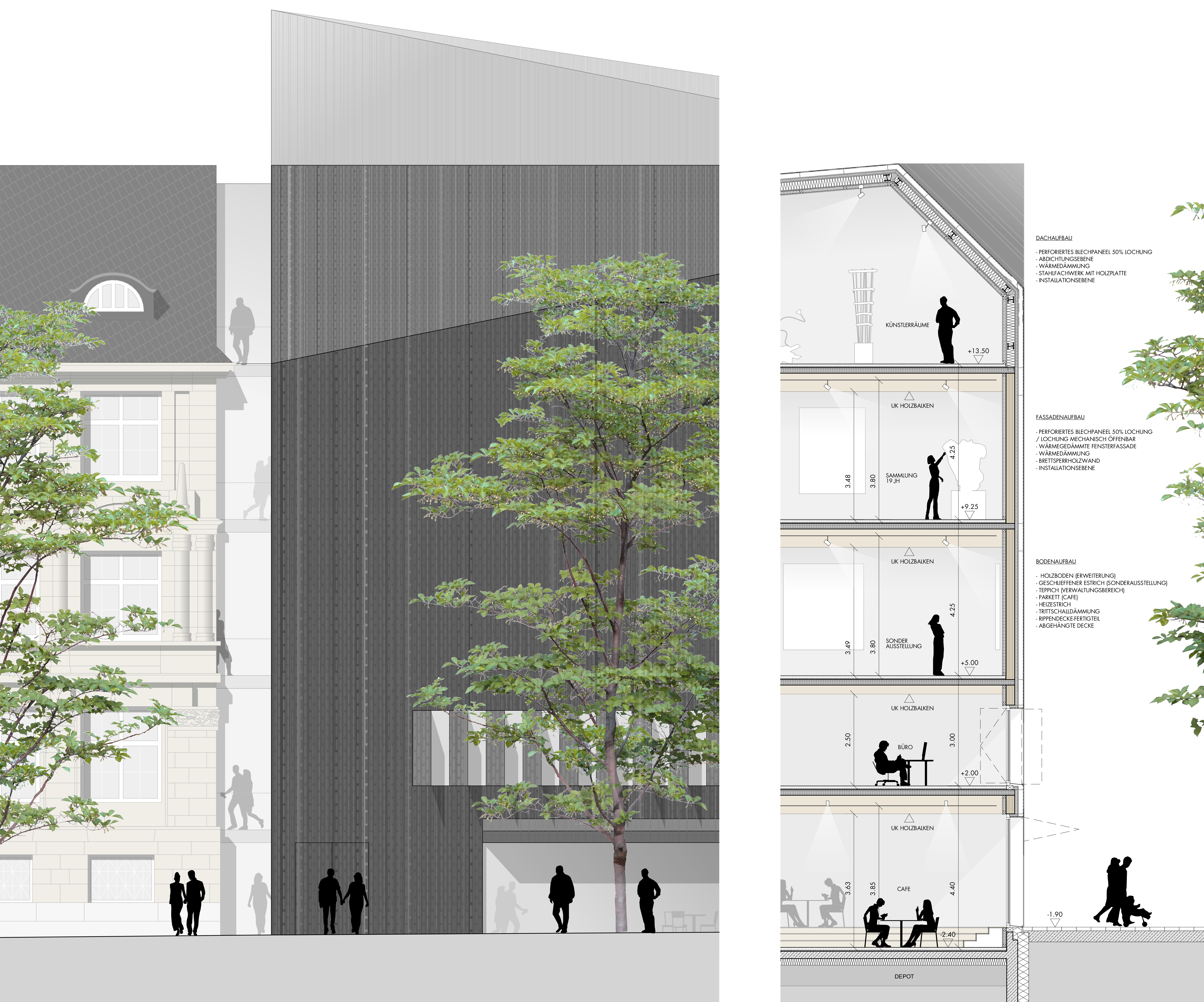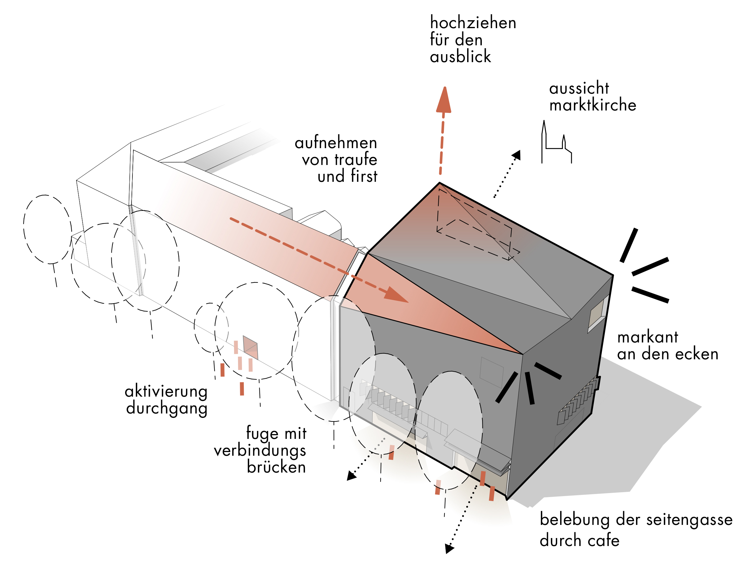 as the final element of the museum complex, the new building makes a bold architectural statement while integrating naturally with the existing structures. its distinctive roof form evolves from the existing geometry and shapes an unmistakable silhouette. by unfolding the roof, an elevated terrace with a viewing balcony is created, while the café, with its openable façade, enlivens the alley and visibly opens the museum to the city.