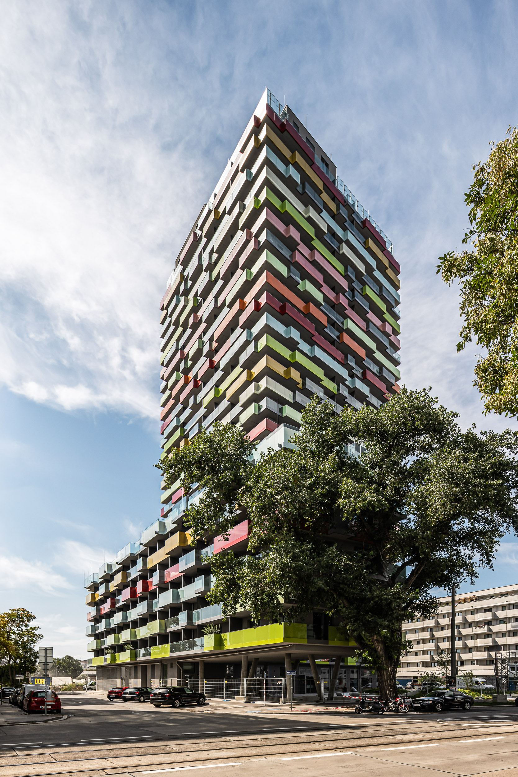 um das tor zum nodwestbahnhof areal klar zu markieren und großzügigen städtischen raum zu schaffen, wurde das hochhaus an der nordwestecke des bauplatzes dresdner straße 90 situiert. es ermöglicht einen urbanen entreeplatz‘, der als drehscheibe für das gesamte gebiet fungieren soll. der baukörper auf der dresdner straße 84 folgt der blockrandbebauung und markiert den schnittpunkt der achsen dresdnerstraße/traisengasse.