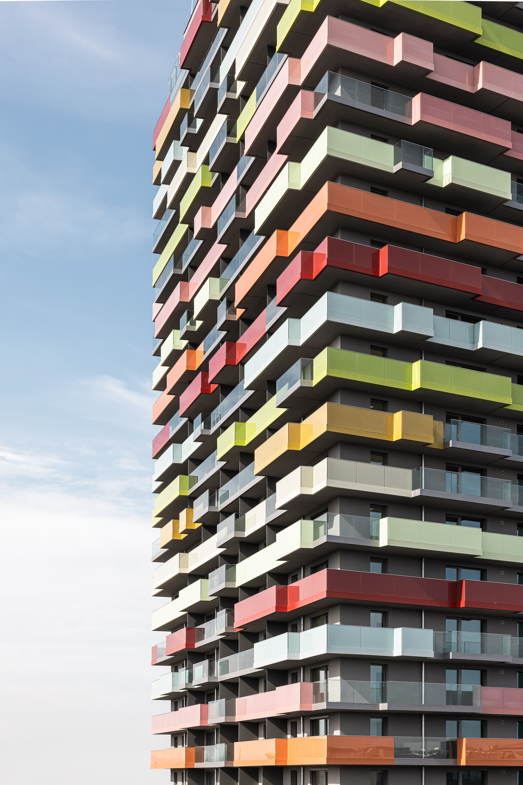 eine umlaufende 1,20 m breite loggienzone bietet jedem aufenthaltsraum zusätzlich hochwertigen freiraum. punktuell wird das loggienband auf eine nutzbare tiefe von 1,80 m erweitert. 3 unterschiedliche brüstungselemente charakterisieren die loggienzone und können nach den bedürfnissen der bewohner angeordnet werden. ein lebendiges fassadenspiel wird so geschaffen.