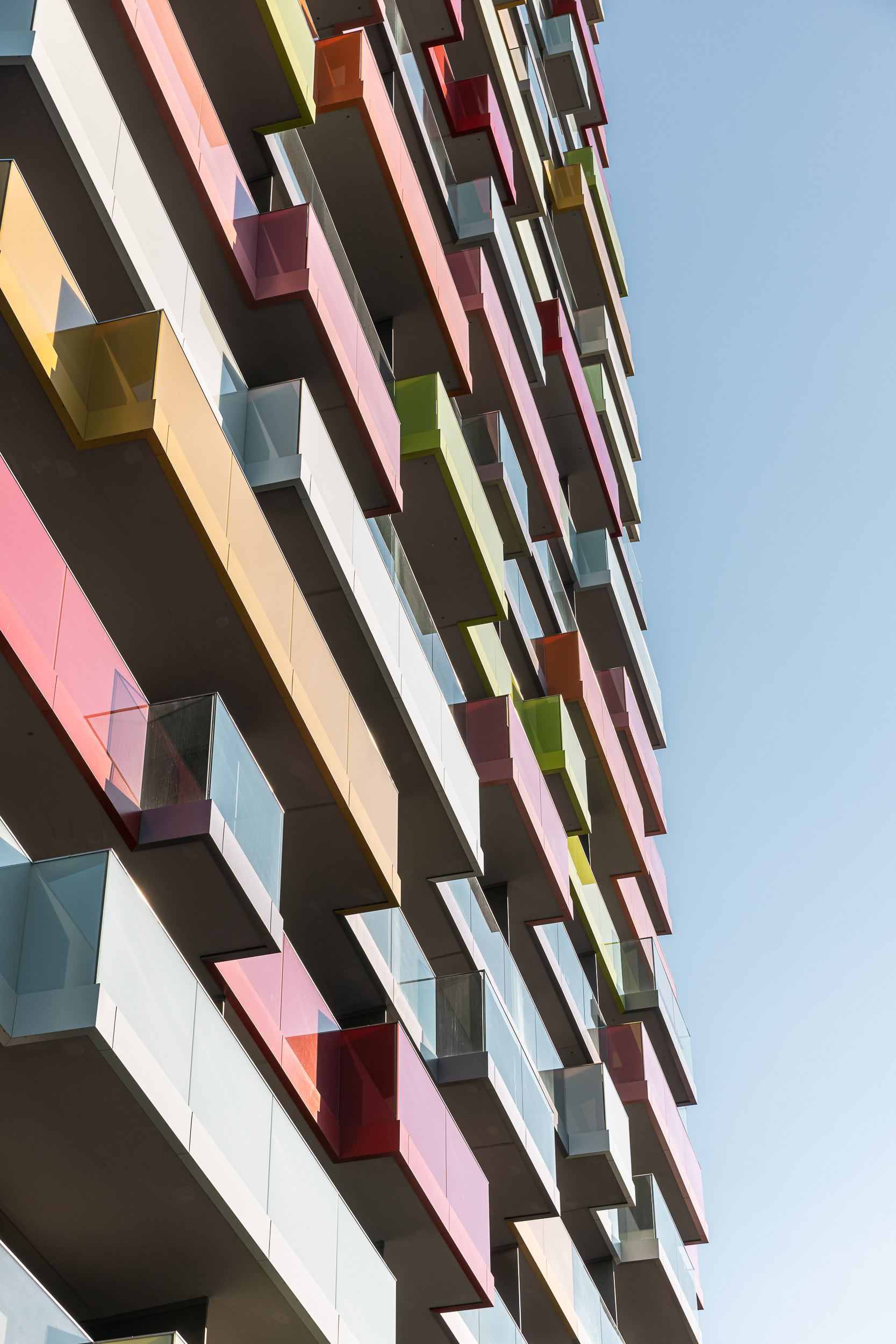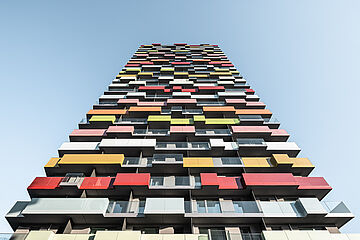 die fassade zwischen den glaselement wird mit unterschiedlichen farben geputzt. die farbcodes werden mit den projektbeteiligten und der stadt im dialog entwickelt.