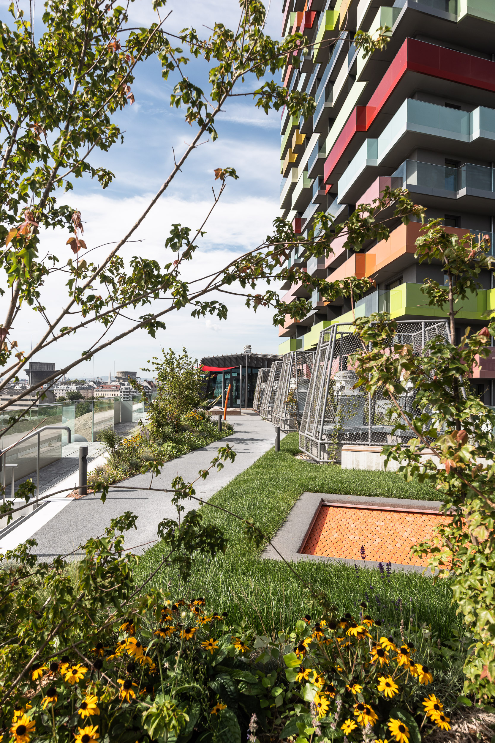 die kompaktheit der baukörper mit einem effizienten fläche-volumen-verhältnis, sowie die erschließung mit jeweils einem kern stehen für die wirtschaftlichkeit und ökologie des projektes. baumpflanzungen und pflanzbeete strukturieren den öffentlichen raum und die dachflächen werden begrünt. die dachlandschaft bietet raum für unterschiedliche nutzungen: kindergarten-freifläche, kinder- und jugendspielplatz, gemeinschaftsterrasse und möglichkeiten zum gärtnern.
