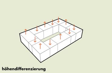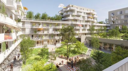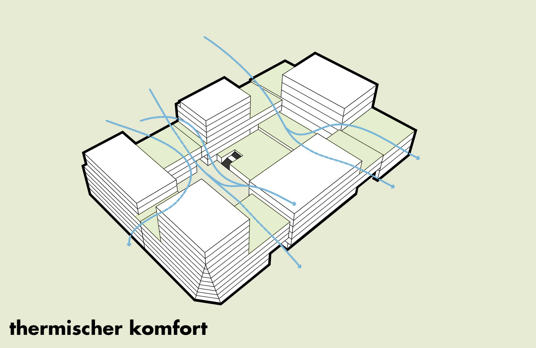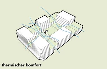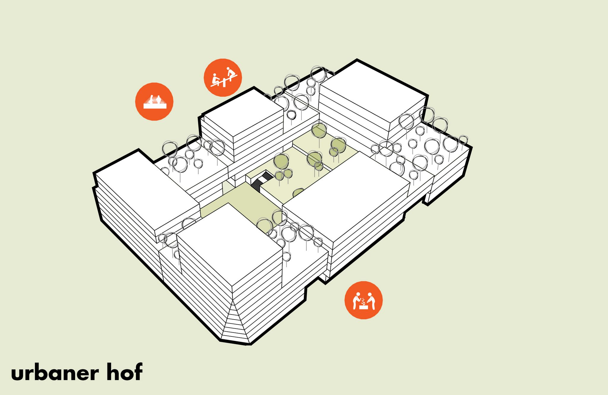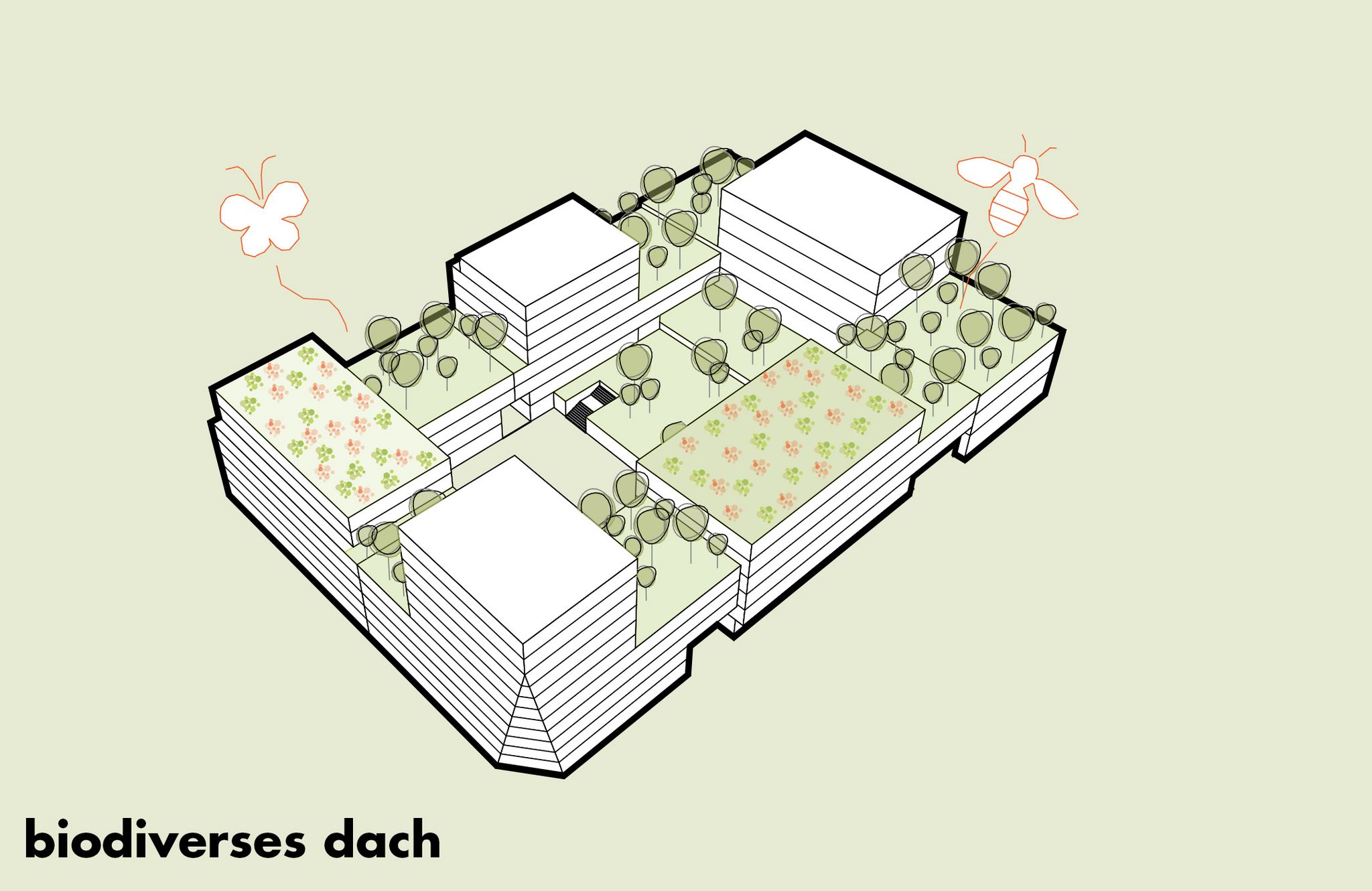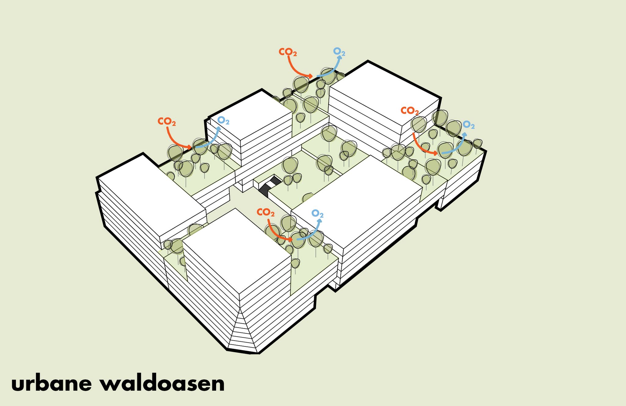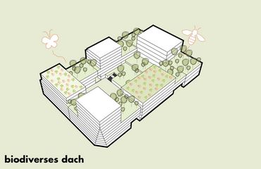 die begrünten dachterrassen und halböffentlichen plätze im innenhof schaffen nicht nur wertvollen raum für die bewohner*innen und nutzer*innen, sondern tragen auch aktiv zur abkühlung der umgebung bei. kletterpflanzen ranken entlang der fassade und leisten einen weiteren wesentlichen beitrag im umgang mit temperaturschwankungen und urbaner schallabsorption bei. die förderung von biodiversität erlaubt einen naturnahen ort und verbessert spürbar das mikroklima - eine "waldoase" inmitten der stadt.