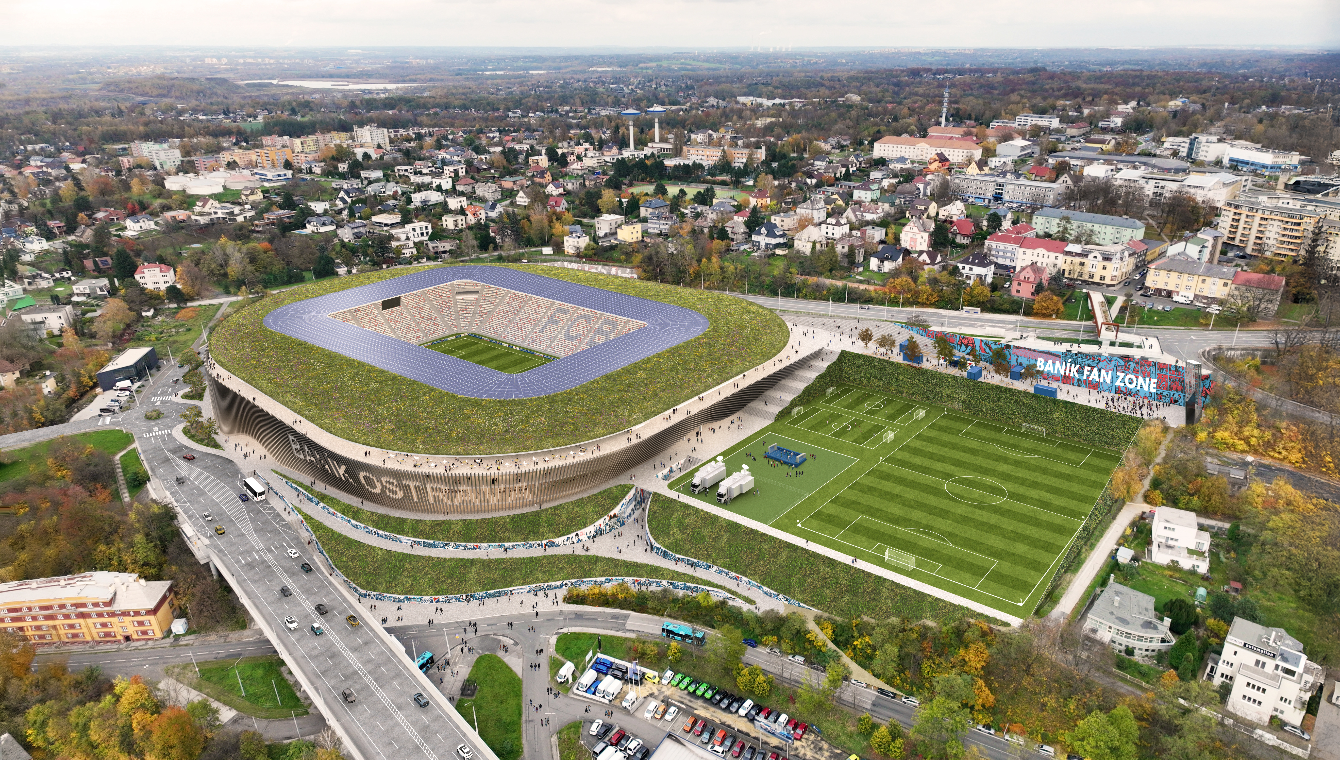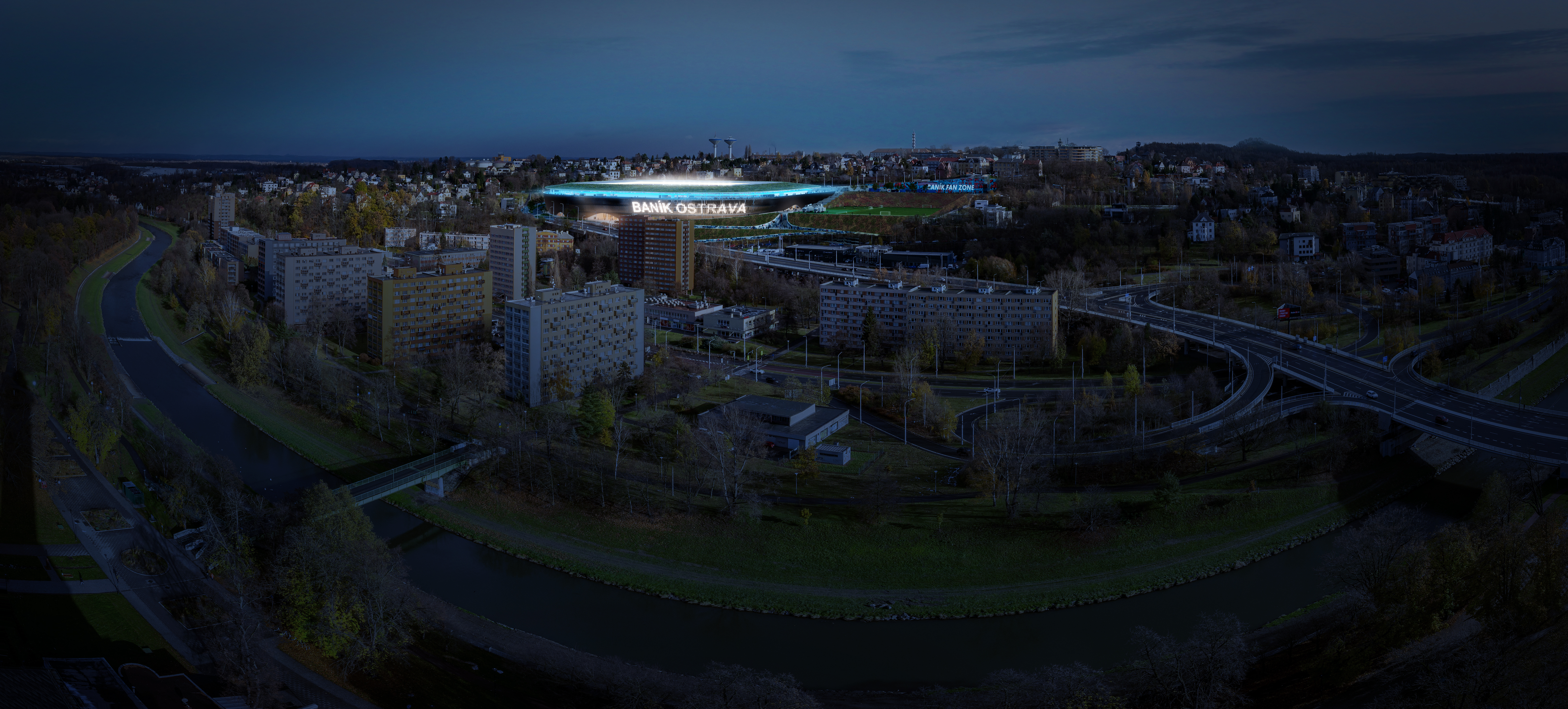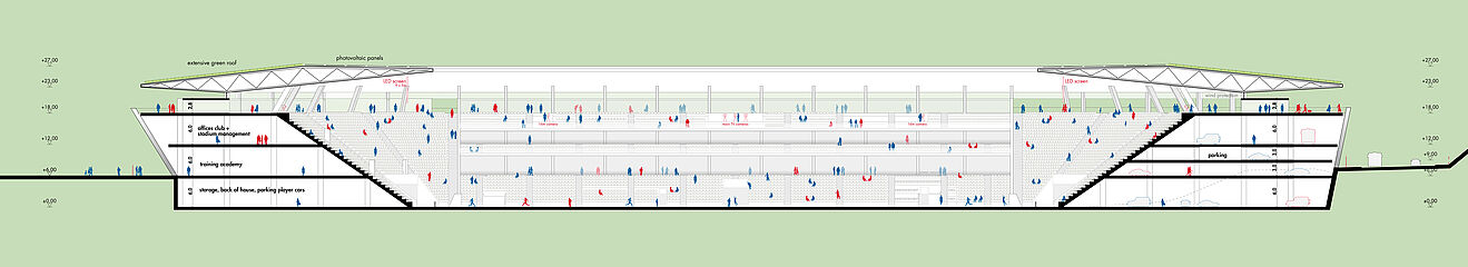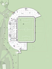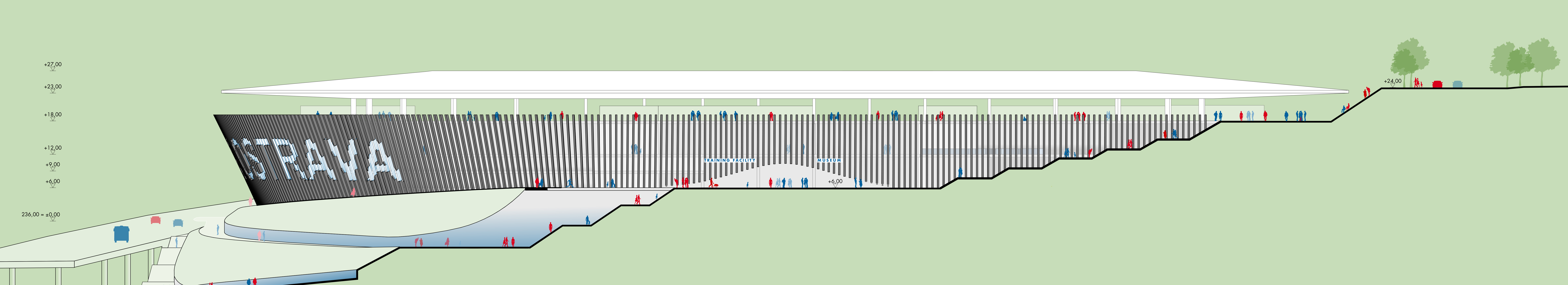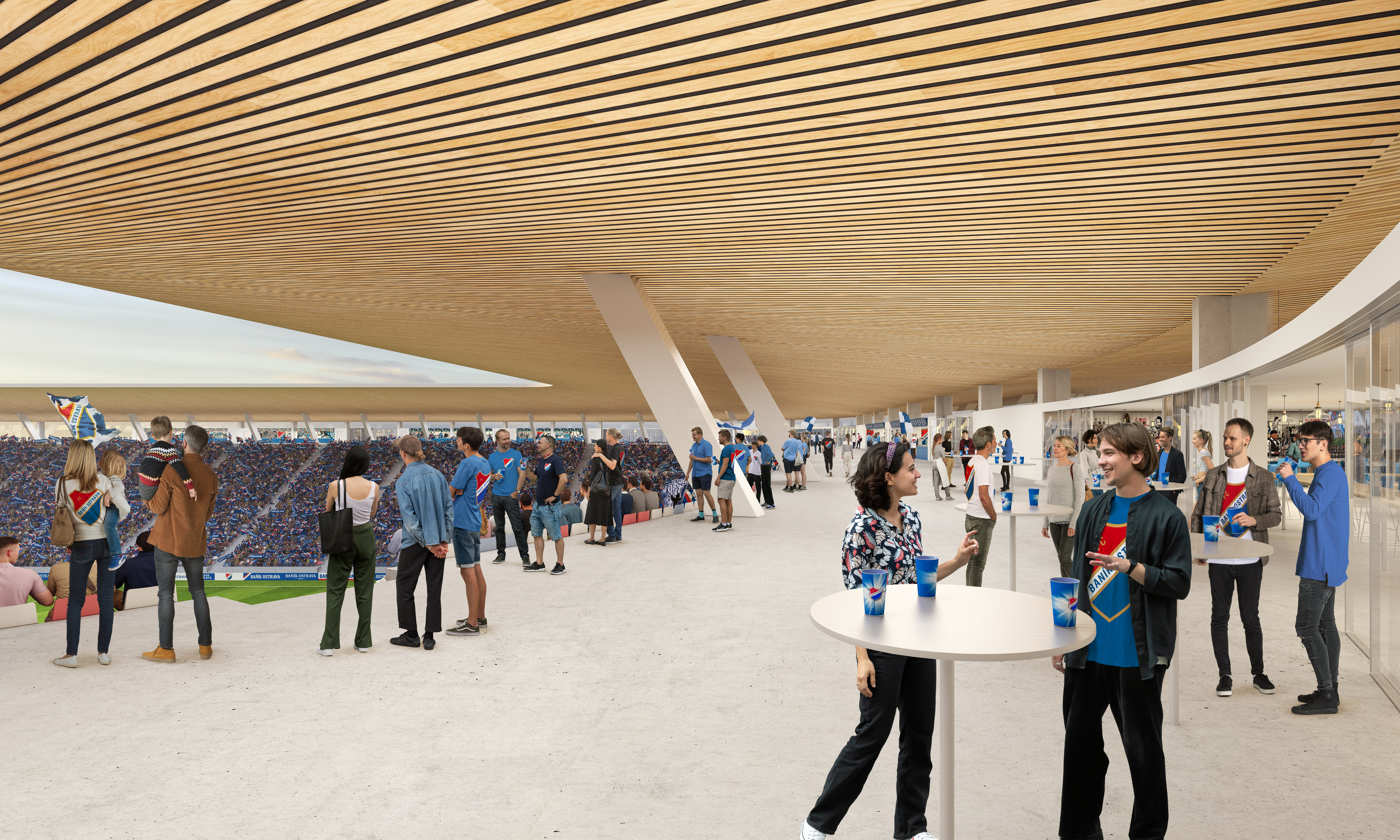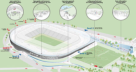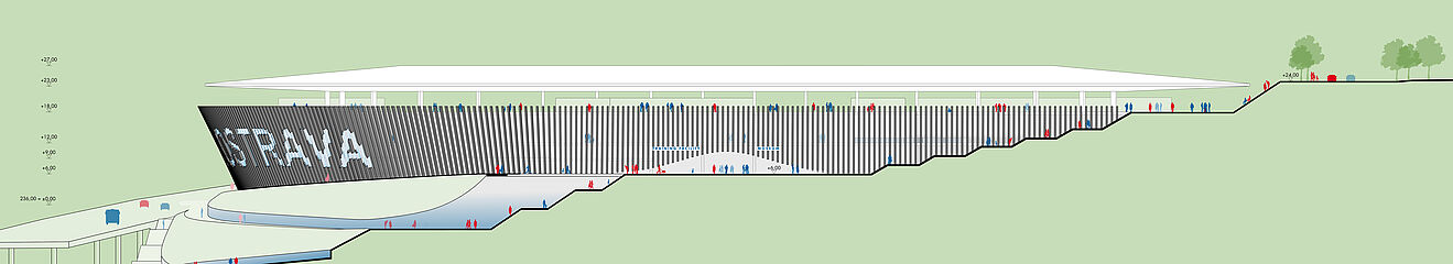 außerhalb der spieltage verwandelt sich das stadion in eine öffentliche städtische plattform mit biergarten, fanzone und dachterrassenbar, die die gemeinde einlädt, den stadion das ganze jahr über zu genießen. eine grüne, artenreiche böschung und ein fußgängerfreundlicher zugang schaffen eine einladende, nachhaltige umgebung – so wird das stadion nicht nur zu einer sportstätte, sondern zu einem neuen wahrzeichen für ostrava.
