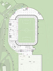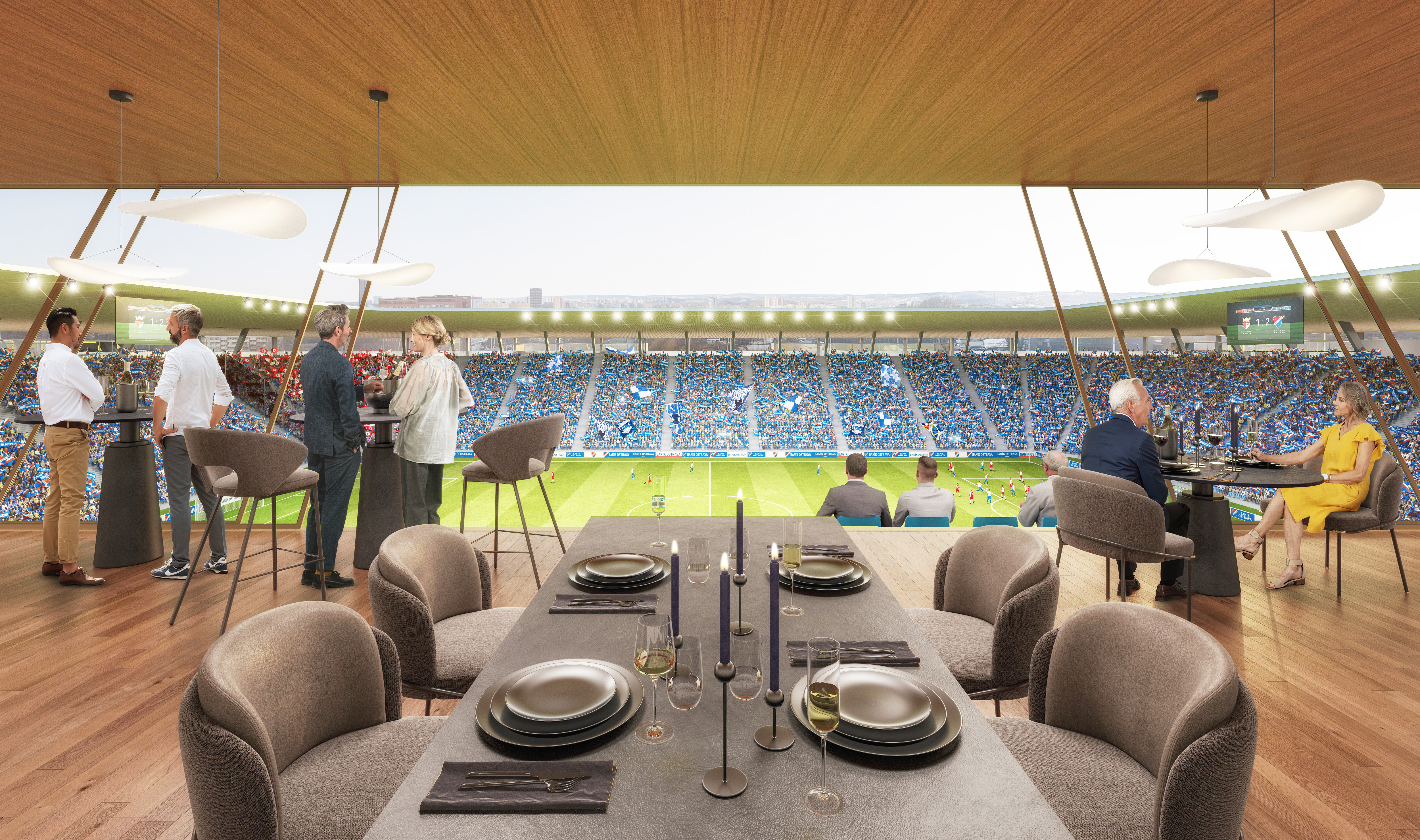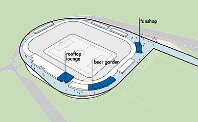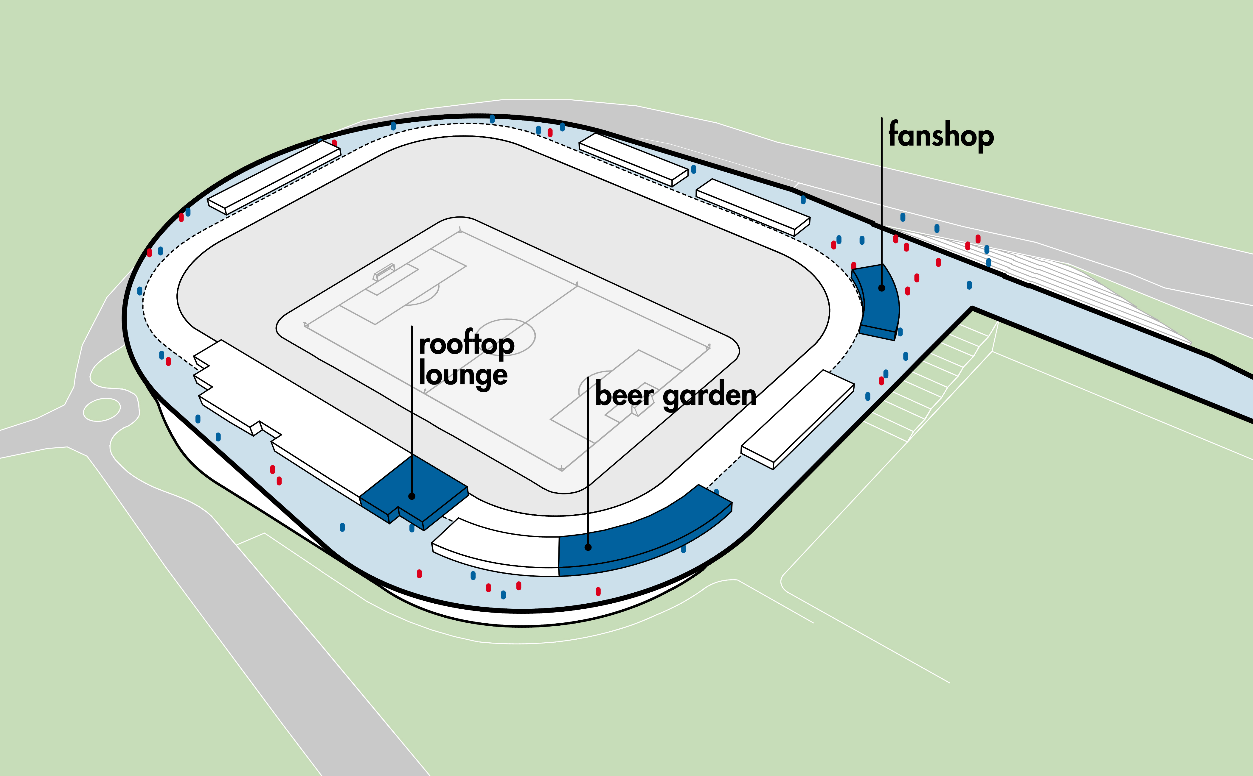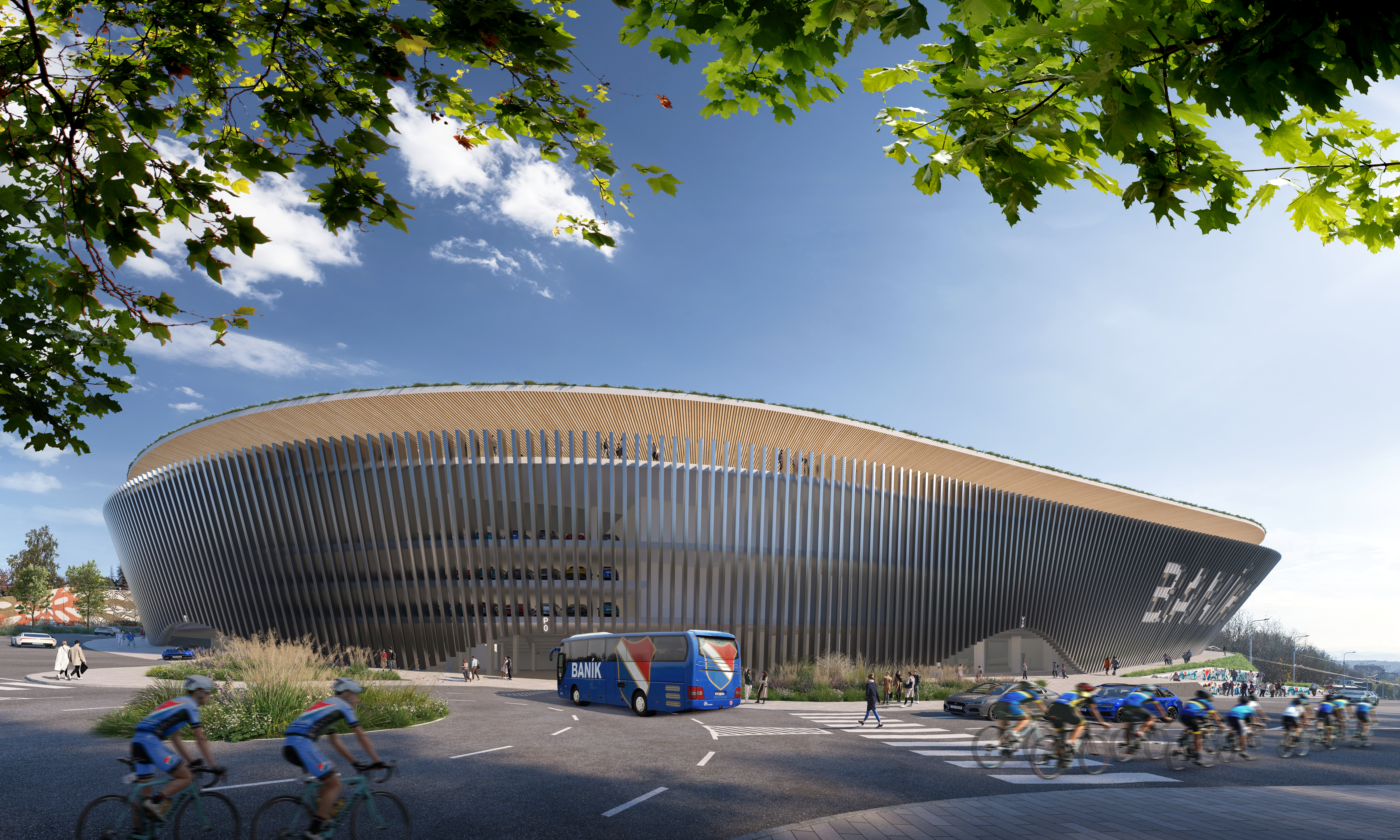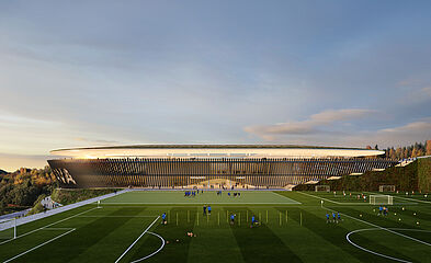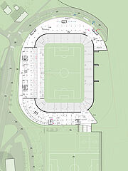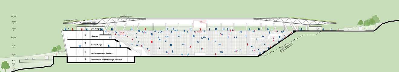außerhalb der spieltage verwandelt sich das stadion in eine öffentliche städtische plattform mit biergarten, fanzone und dachterrassenbar, die die gemeinde einlädt, den stadion das ganze jahr über zu genießen. eine grüne, artenreiche böschung und ein fußgängerfreundlicher zugang schaffen eine einladende, nachhaltige umgebung – so wird das stadion nicht nur zu einer sportstätte, sondern zu einem neuen wahrzeichen für ostrava.