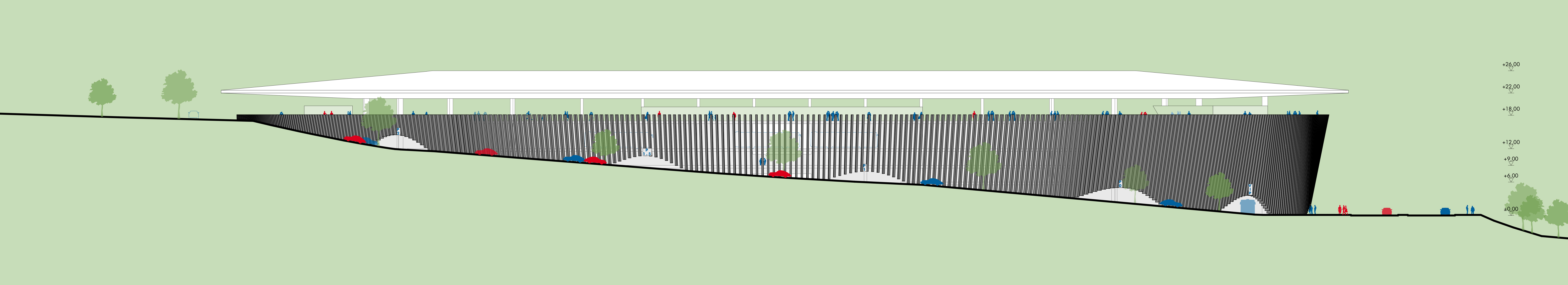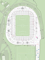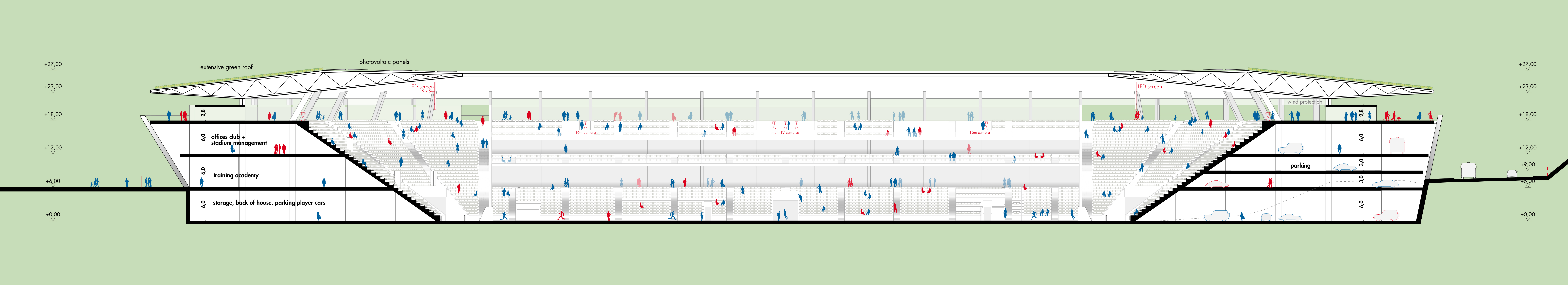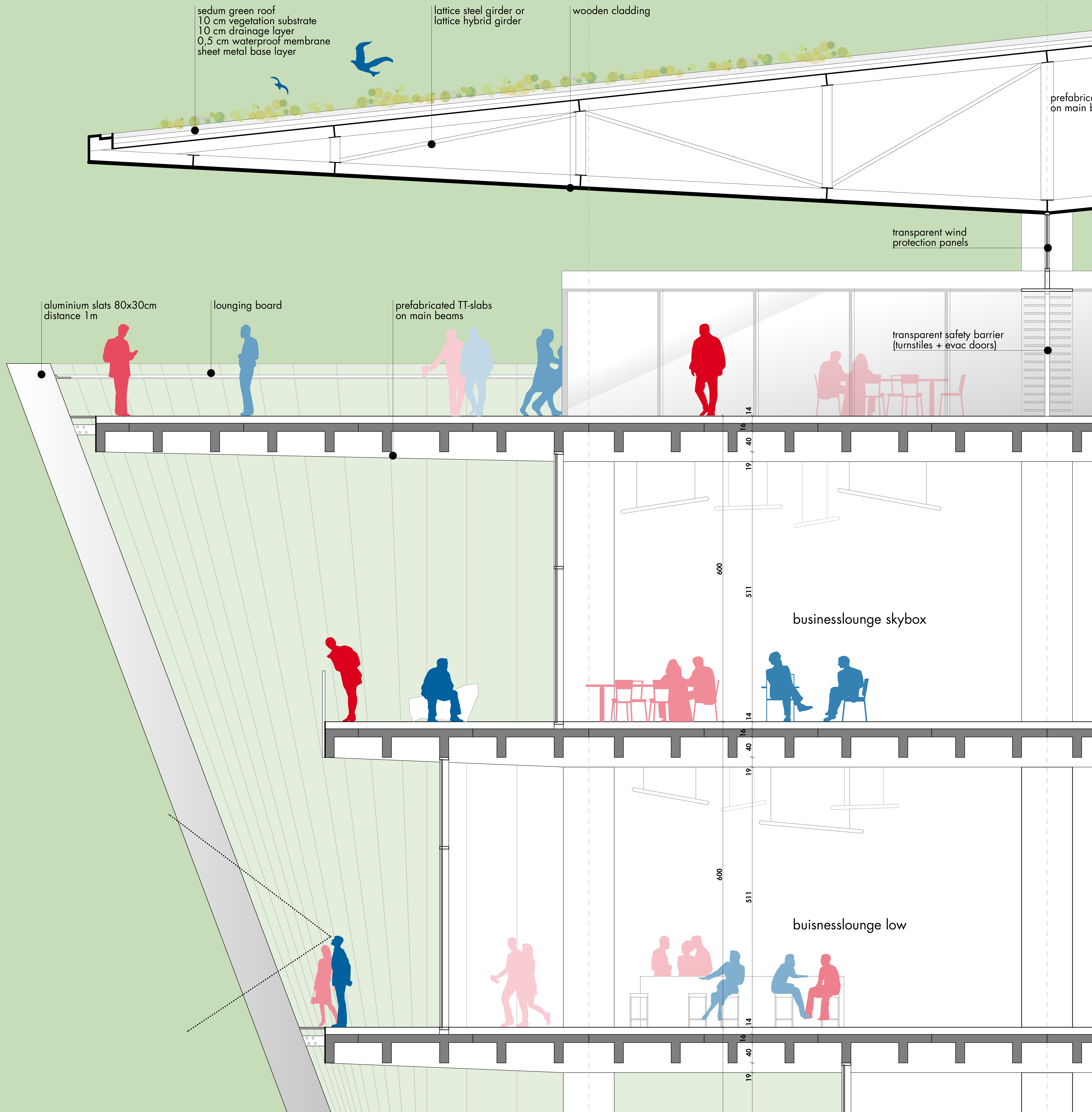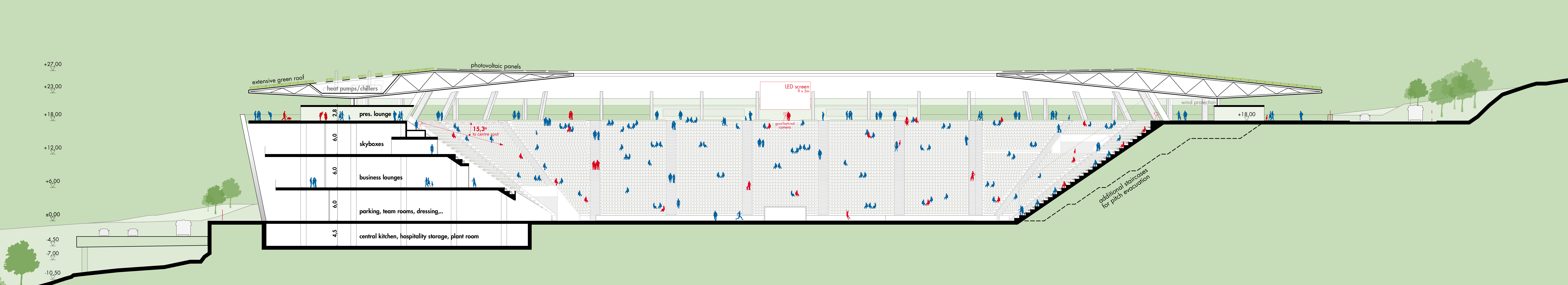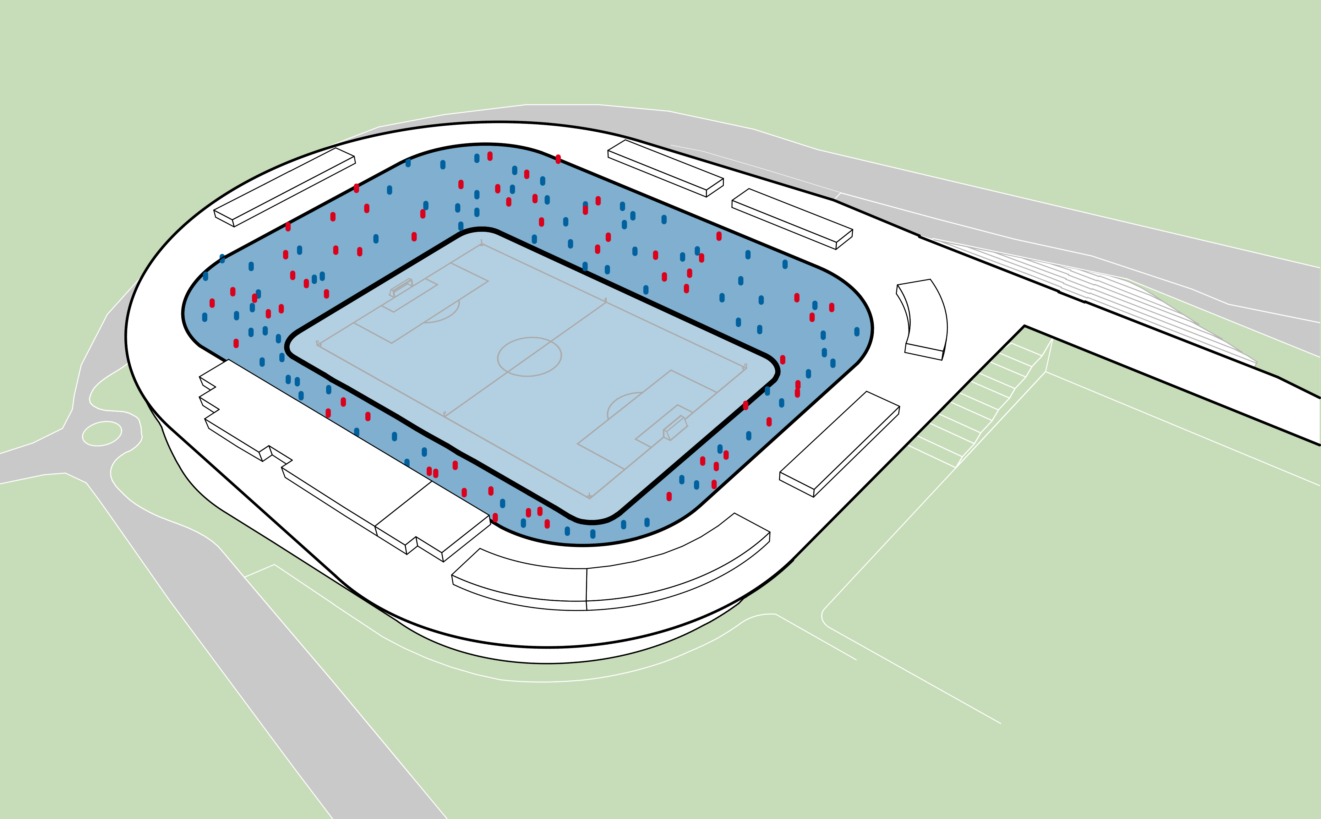 außerhalb der spieltage verwandelt sich das stadion in eine öffentliche städtische plattform mit biergarten, fanzone und dachterrassenbar, die die gemeinde einlädt, den stadion das ganze jahr über zu genießen. eine grüne, artenreiche böschung und ein fußgängerfreundlicher zugang schaffen eine einladende, nachhaltige umgebung – so wird das stadion nicht nur zu einer sportstätte, sondern zu einem neuen wahrzeichen für ostrava.